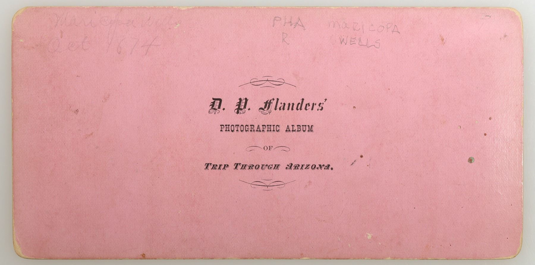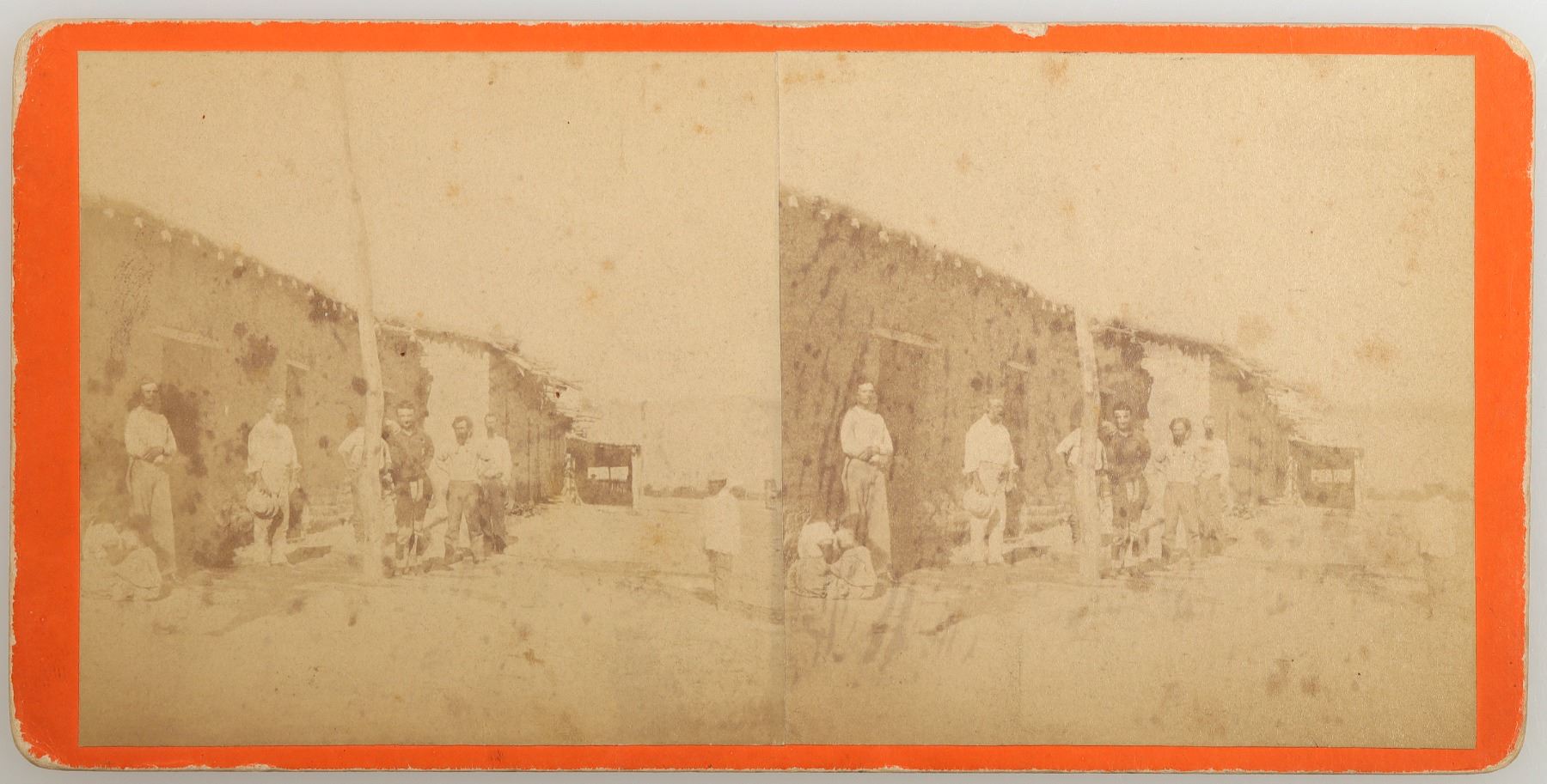 This stereoview by Dudley Flanders has an open front mount is orange, no signage. The back mount is pink "D.P. Flanders'/Photographic Album/of/Trip Through Arizona". In light pencil "MARICOPA WELLS" "Oct 1874". Not cataloged by Rowe. (ref. Arizona Stereographs 1865-1930 By Rowe, p.269). Minor foxing left side, low color contrast, very good condition. The scene depicted are several men in front of an adobe structure. Maricopa Wells was a watering hole for travelers on the Southern Emigrant Trail to California. It was later abandoned after the completion of the railroad. Arizona c.1874