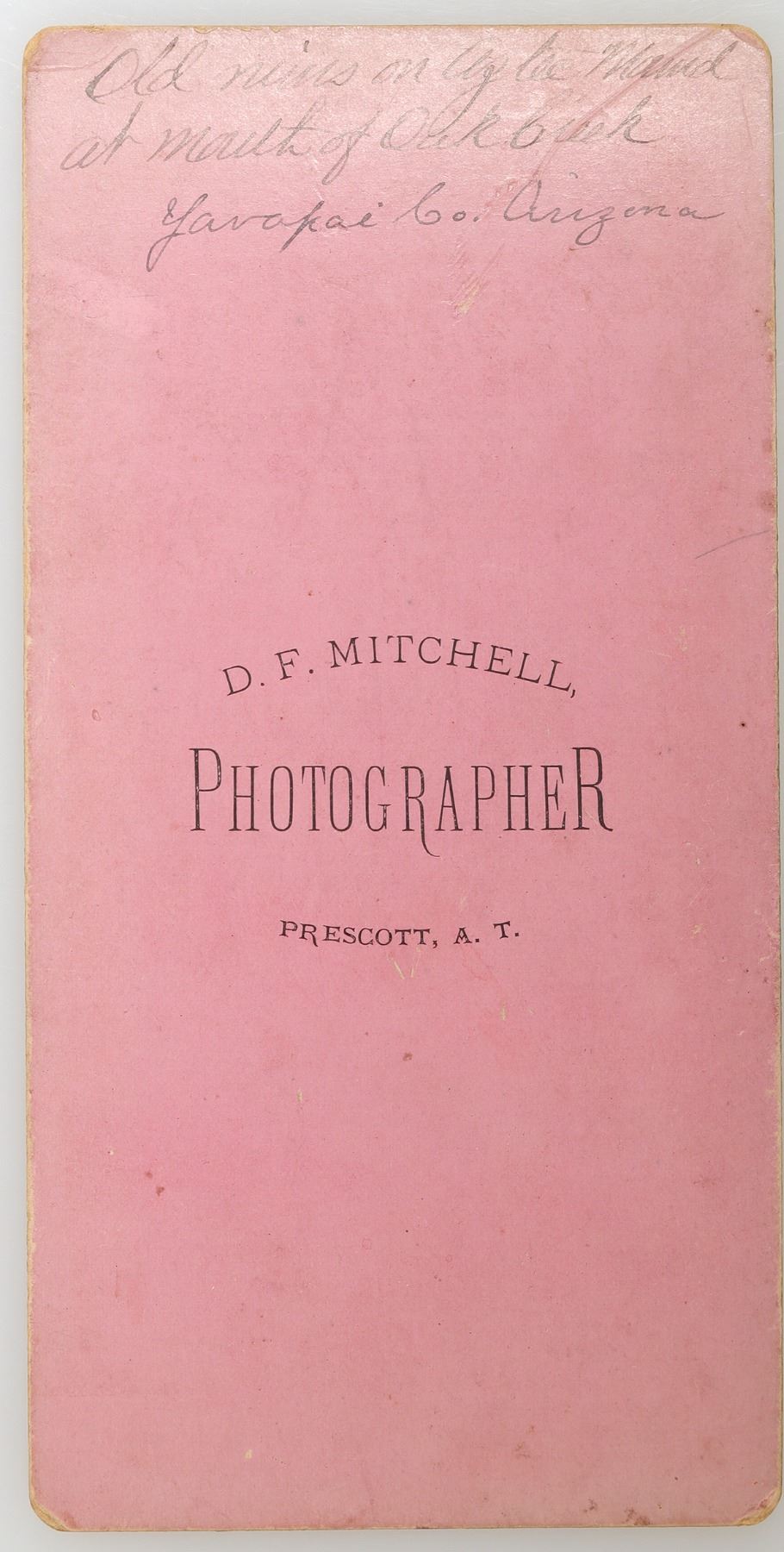 This stereoview is by photographer Daniel F. Mitchell and is marked in script on the back "old ruins on Aztec Mound at mount of Oak Creek/ Yavapai Co. Arizona/ D.F. Mitchell Photographer/ Prescott, A.T." in an oval shape. c.1875-1882, orange mount front/ lavender mount back. (ref. Arizona Stereographs 1865-1930 by Rowe p. 283). No identifiers on the front, spot on left image. Very good condition. 7 in. X 3.5 in. Arizona