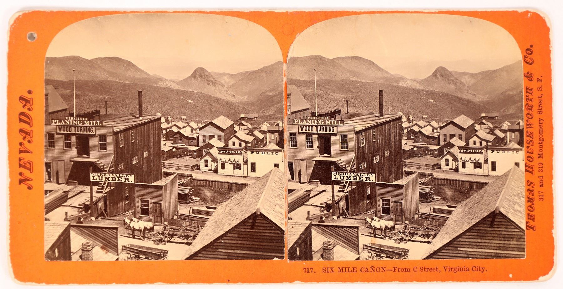 Nice view looking down from B Street to C Street and Sixmile Canyon in the background. Thomas Houseworth & Co., 317 & 319 Montgomery St., SF. From a "Nevada" series, this is No. 717, "Six Mile Canon--From C Street, Virginia City." Stamped on the back "Mary Hooper." Good contrast, focus, and content! Business signs in view include the Virginia Planing Mill, Sierra Valley Lumber, and the Virginia Public School. Wear to edges of card. One photo starting to peel up.