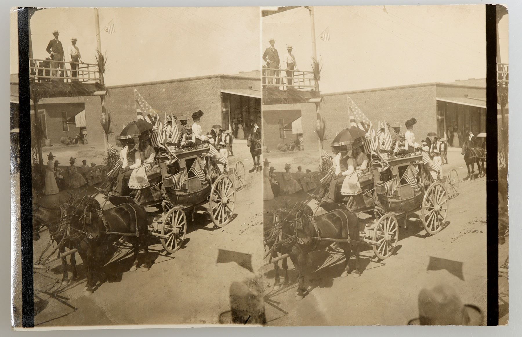 This stereoview appears to be a copy of a 4th of July stagecoach. Black framing borders break the original photograph. On the back is "X39311" indicating a copy made (possibly) by Keystone View Co., Underwood & Underwood or C. E Watkins of S.F. ,Cal. C. 1910. Several of these companies used high number notations. (ref. Arizona Stereographs 1865-1930 by Rowe pp. 275, 276, 289,292). 7 in. X 4.25 in. Sharp focus, good contrast. Arizona