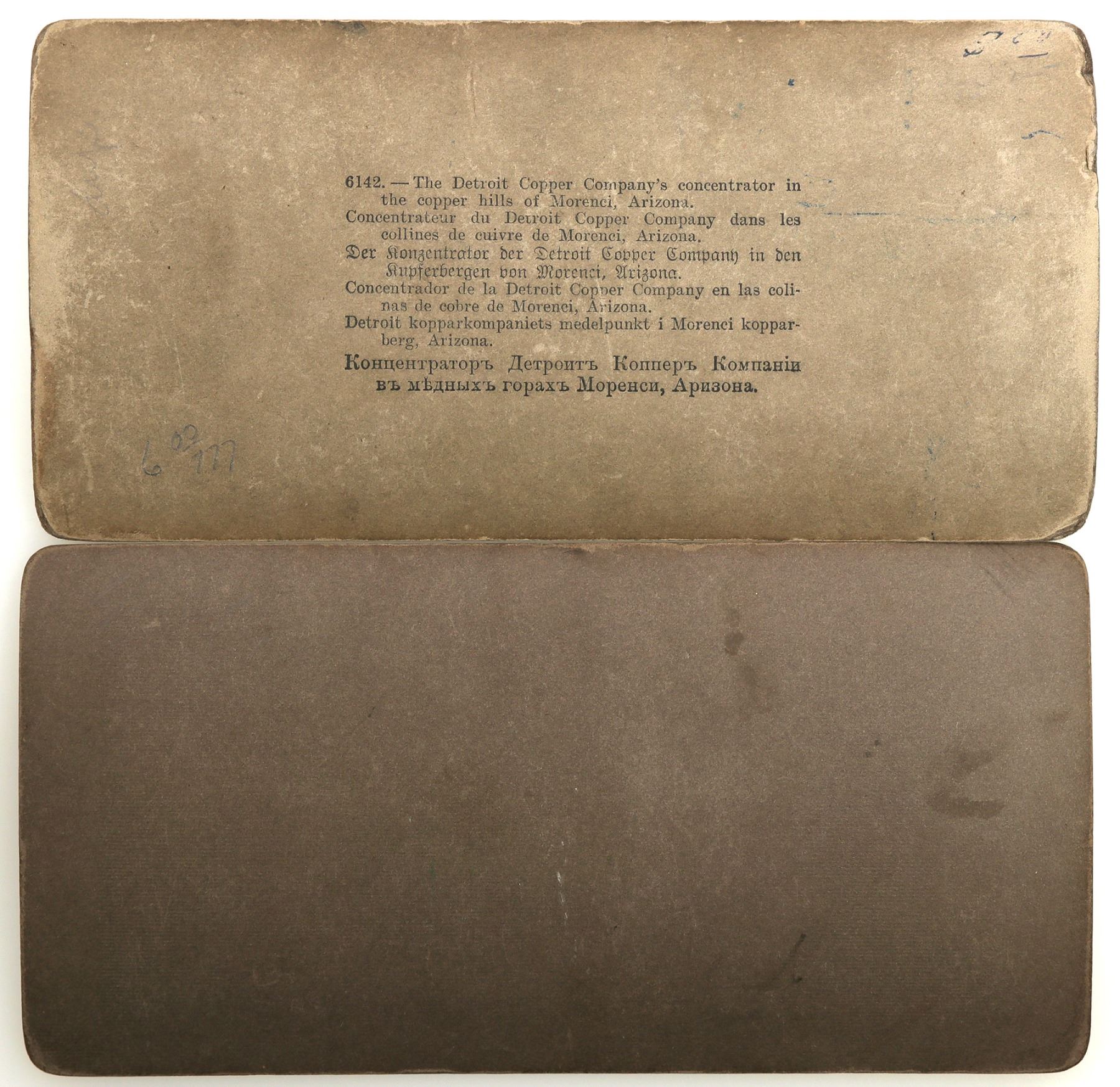 These are two stereoviews of the Morenci mining area. On the left edge "Underwood & Underwood Publishers/ New York, London, Toronto-Canada, Ottawa-Kansas" on the right edge "Works and Studios/Arlington, N J., Westwood, N.J." grey mount front and back. "The Detroit Copper Company's Concentrator in the hills of Morenci Arizona" printed bottom below right image. c. 1903. "S-25x " ink stamped upper right corner. The back in print: "6142- The Detroit Copper Company's concentrator in the copper hills of Morenci, Arizona", printed in several languages. The image depicts the buildings in the background and several packed burros in the foreground. Good color contrast, foxing on the right edge. (ref. Arizona Stereographs 1865-1930 by Rowe, p.290). The second card is has identical edge markings, grey mount front and back. "A street in the mining camp of Morenci, Arizona/ copyrighted 1903". This image depicts reasonable housing with women and children, a miner with a packed burro in the street. No markings on the back. Not listed in the the Rowe catalog. Rare. Excellent color contrast, sharp image, no foxing. 7 in. X 3.5 in. The Morenci mining district held 145 claims at one point. There was also the Morenci Southern narrow gauge railroad completed in 1901 that connected a number of mines over 18 miles of rail in addition to the "baby" gauge railroad connecting the mine works and plants. Arizona PLEASE CHECK THE PHOTOGRAPH SECTION OF THIS SALE FOR MANY MORE MINING RELATED PHOTOGRAPHS!