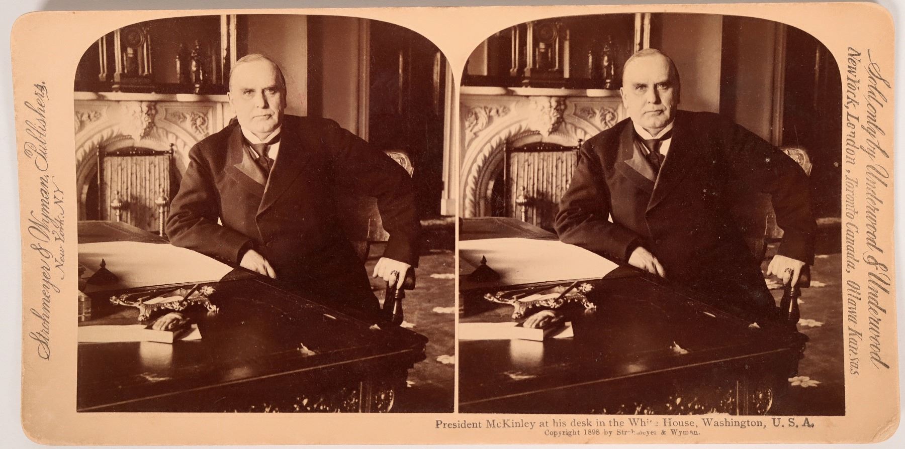 This is a stereo-view postcard of President William McKinley at his desk in the White House. McKinley became the third President in the U.S. to be assassinated while attempting to shake the hand of his assassin in 1901. McKinley declined security protection at the time.