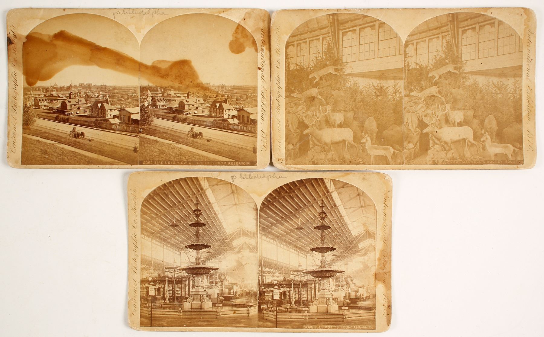 3 stereo views of Philadelphia for Centennial Expo. Edward L. Wilson, W. Irving Adams, Proprietors. Heavy toning on the one of the reservoir view. Please inspect.