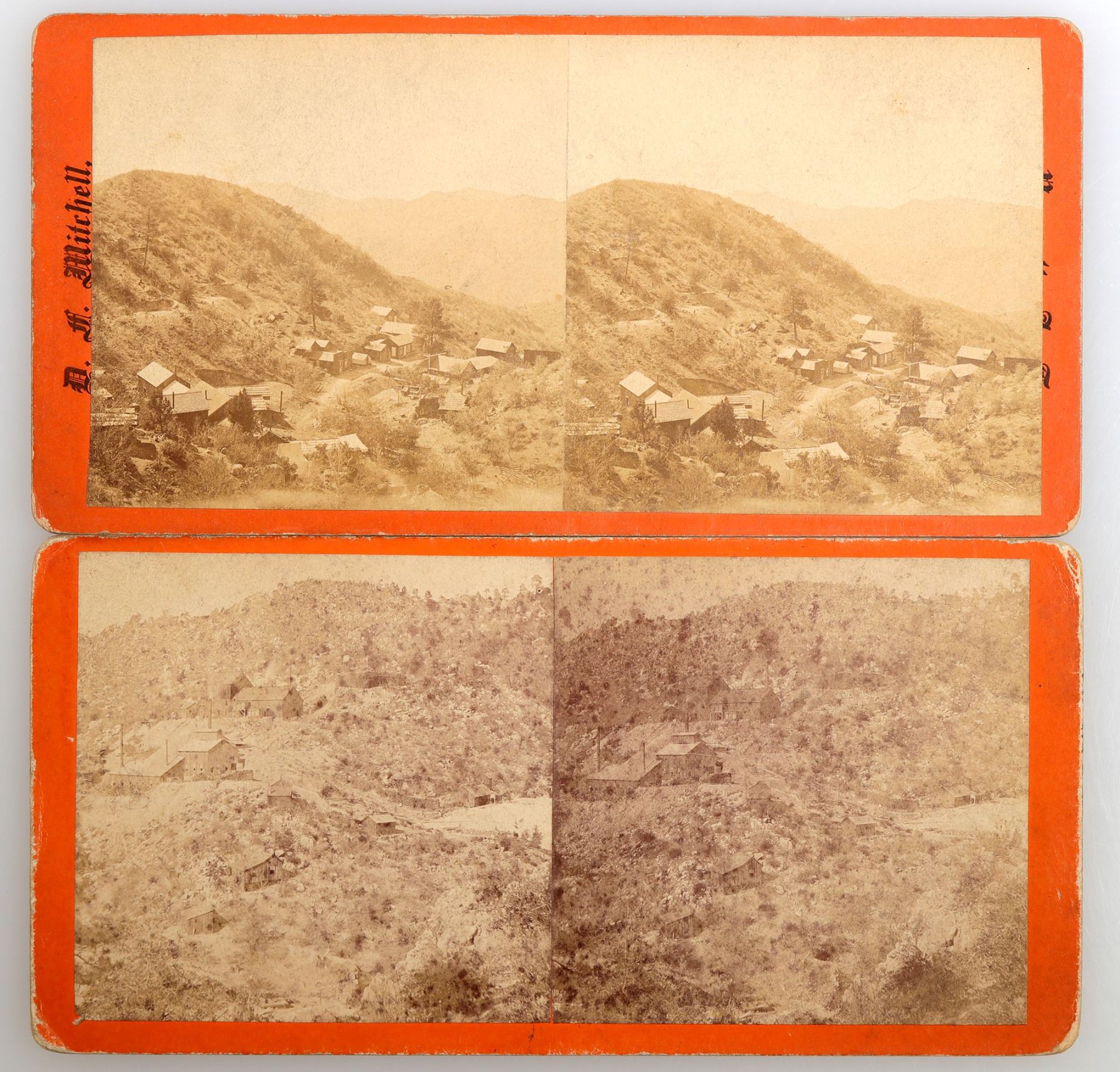 This lot contains two stereoviews of mines in Arizona by D.F. Mitchell. The first is of the Tiger mine originally called the Mammoth Mine when discovered in todays Pinal County. The card is orange on the front, poor quality photo, pink back with hand written identification "Tiger Mine, Mill and Hoisting Works" in script. C. 1885.No other identifications. The mine produced gold, silver, and copper. The second stereoview is possibly of the Big Bug Mine in central Arizona. The card is orange on the front with "D.F. Mitchell" on one side and "Prescott, AZ " mostly covered on the other end. The reverse side is pink without any other notation. C. 1875-1881. The Big Bug mine site was noted for its gold and an Indian attack during the Apache Wars. Both are 7 in. X 3.5 in. very good condition. (ref. Arizona Stereographs 1865 to 1930 by Rowe p.282, 283) Arizona c. 1880s
