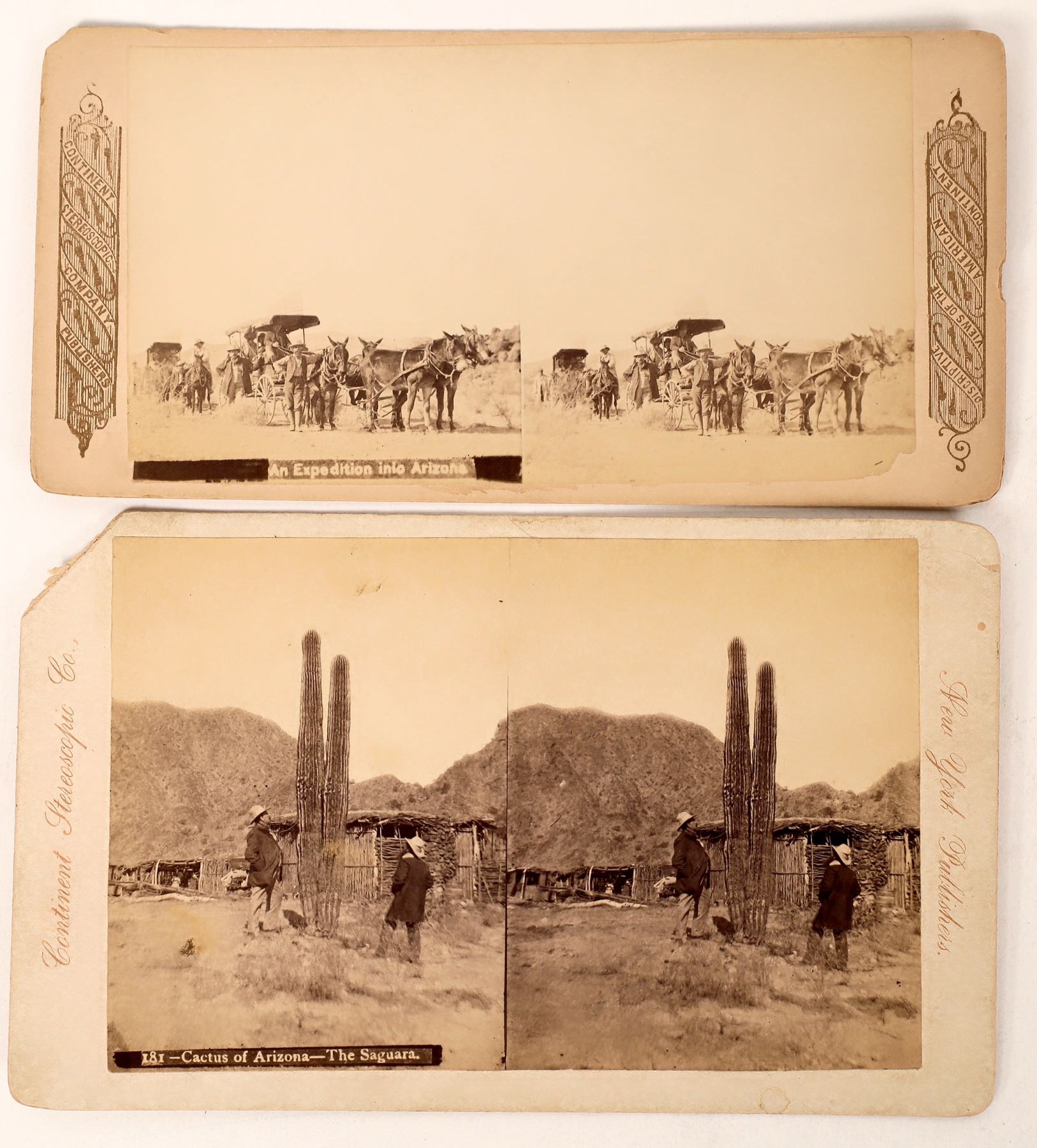 "Continent Stereographic Co." left border, "New York Publishers" right border, buff color front and back, "181 Cactus of Arizona-The Saguaro" (with Pima Villages in the background). Two men observing a large saguaro cactus. No markings on the back. Torn upper left corner, good contrast, good condition. C. 1877. 7 in. X 4.25 in. (ref. Arizona Stereographs 1865-1930 by Rowe p. 265). A second view "Continent Stereographic Co. Publishers/ Descriptive Views of the American Continent" on the borders, ivory/ivory mount front and back. (57) "An Expedition into Arizona" bottom center. On the back ink stamped "Phillips'/ 2273/2275 Third Avenue" (New York). Torn upper left corner, low contrast. Good condition. Two canvas covered wagons pulled by horses. C. 1877. 7 in. X 3.5 in. (ref. Arizona Stereographs 1865-1930 by Rowe, p. 266).