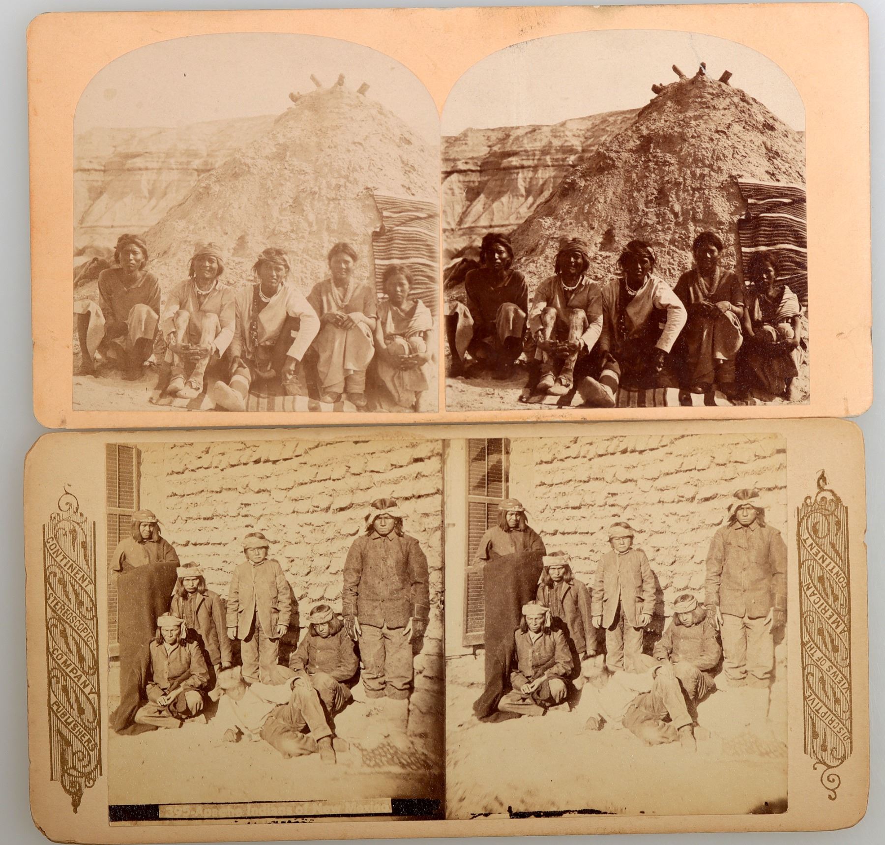 This lot has a stereoview of seven Indian men "395 Apache Indians of New Mexico" (posed group of 7 males) by "Continent Stereoscopic Co. Publishers/ 395 Apache Indians of New Mexico" at the bottom border, ivory mount front and back, "Philips',/2273,2275 Third Avenue" (New York) on the back. Low contrast excellent condition. C.1877. (ref. Arizona Stereographs 1865-1930 by Rowe p. 266). A second stereo view is of five (Navajo) adults posing near a dwelling with a blanket entry. On yellow mount front, buff colored back, in pencil marked "Hillers". No other markings. Possibly from the Indians of the Colorado Valley. (ref. Rowe p. 273). C.1874. High/low contrast sharp focus, minor foxing right side. Arizona