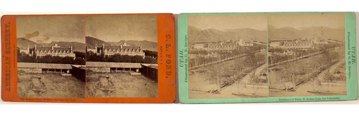 Two different. 1) Residence of Prest. B. Young from the University. C.R. Savage, photographer, Pioneer Art Gallery, Salt Lake City. Medium contrast. 2) No. 642--Brigham Young's Residence, Salt Lake City, Utah. C.L. Pond, photographer, American Scenery. Good contrast, but staining on left panel. (Prag Collection)