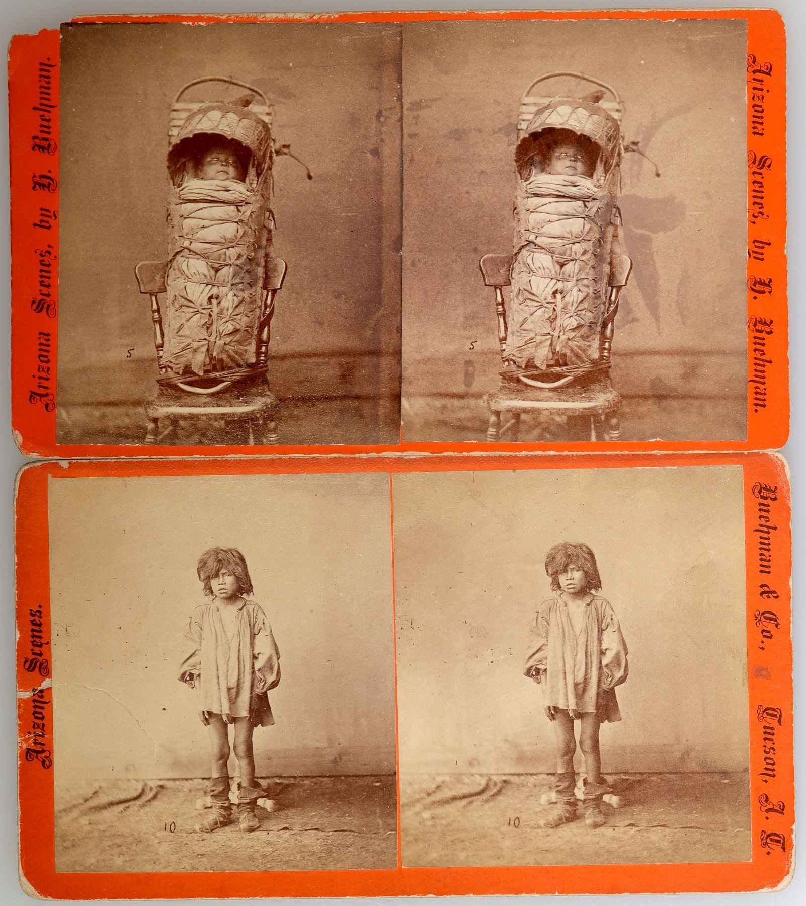The photographer Henry Buehman worked first in Prescott and later in Tucson, Arizona. He is most noted for developing stereoviews of children and babies for proud mothers. From his "Arizona Scenes" series are: Indian Boy (#7 possibly) c.1875-1878 orange mount front/ lavender mount on back "Buehman Co. Tucson, A.T." right border, and "Arizona Scenes" left border. "Papago" written in ink on the back. The second view is of a baby in a cradleboard on a chair (#5 papoose in cradle basket on chair in studio from the Rowe catalog, not marked on card). Orange mount front/ lavender mount back C.1878-1881. On both borders "Arizona Scenes by H. Buehman". Both images have good contrast with some light foxing in the borders. (ref. Arizona Stereographs 1865-1930 by Rowe pp. 259, 260). Arizona