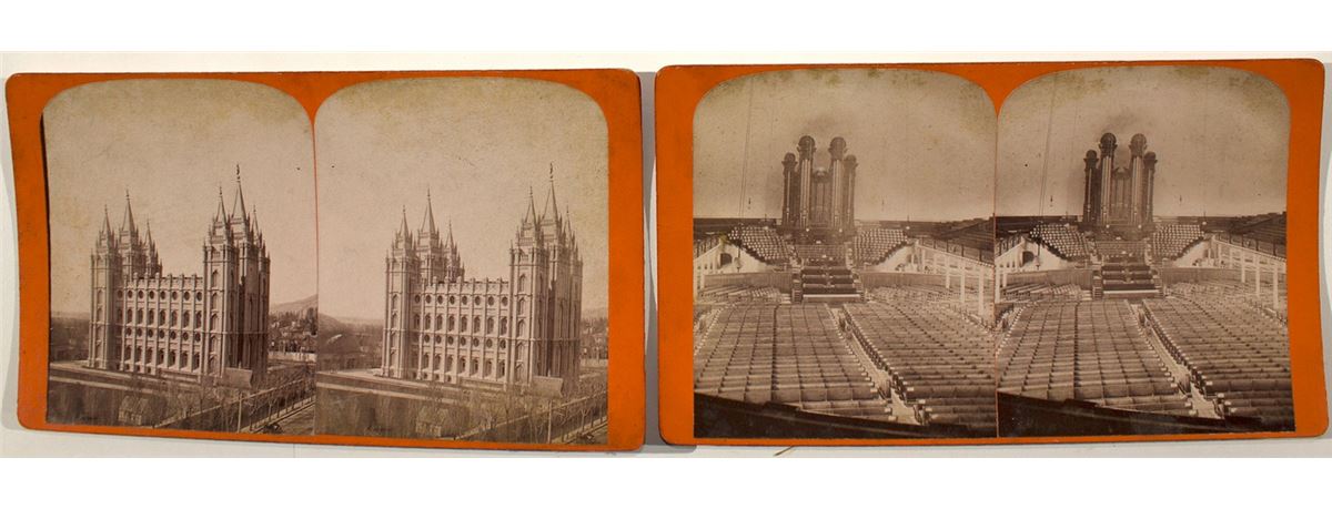 No photographer is identified on either stereoview, though they were certainly done by the same company. Pen notations identify each. The exterior is "Mormon Temple, Salt Lake." View of grand building with mountains distant in bottom right. Some soiling, good contrast. The other is "Interior of Tabernacle (Mormon), Salt Lake." View of pews and stage setup. Soiling, medium contrast. Each card is 4" x 7" (Prag Collection)