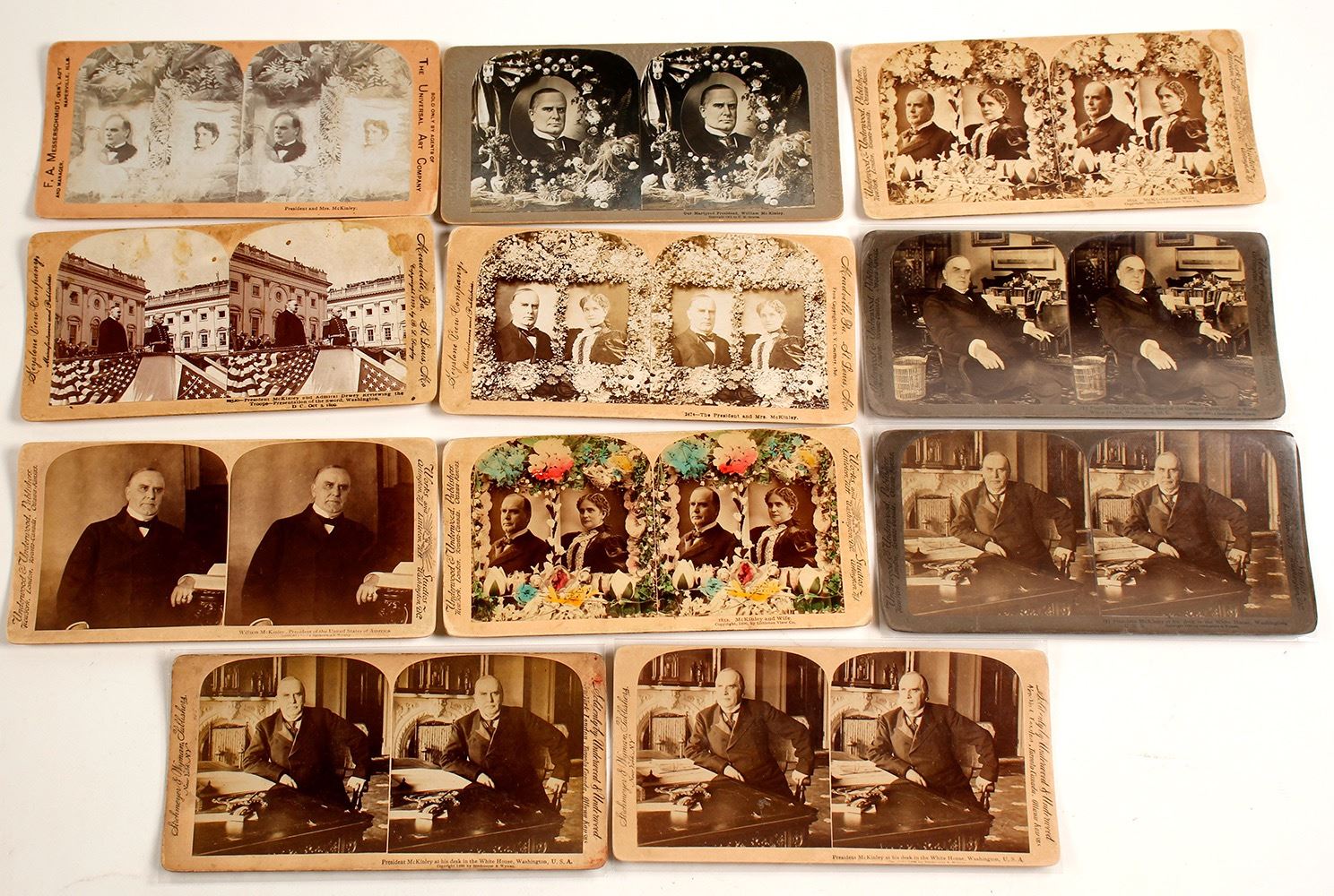 Lot of 11. Seven are Underwood & Underwood: multiple shots of him at desk in White House, as well as portraits of him and Mrs. McKinley (one hand-colored). Two Keystone stereoviews: McKinley and Dewey at Presentation of the Sword ceremony and portraits of McKinley and his wife. Two others: Universal Photo Art Co. stereoview "Our Martyred President" and Universal Art Co. portraits. (Prag Collection) Date: Location: HWAC# 54782
