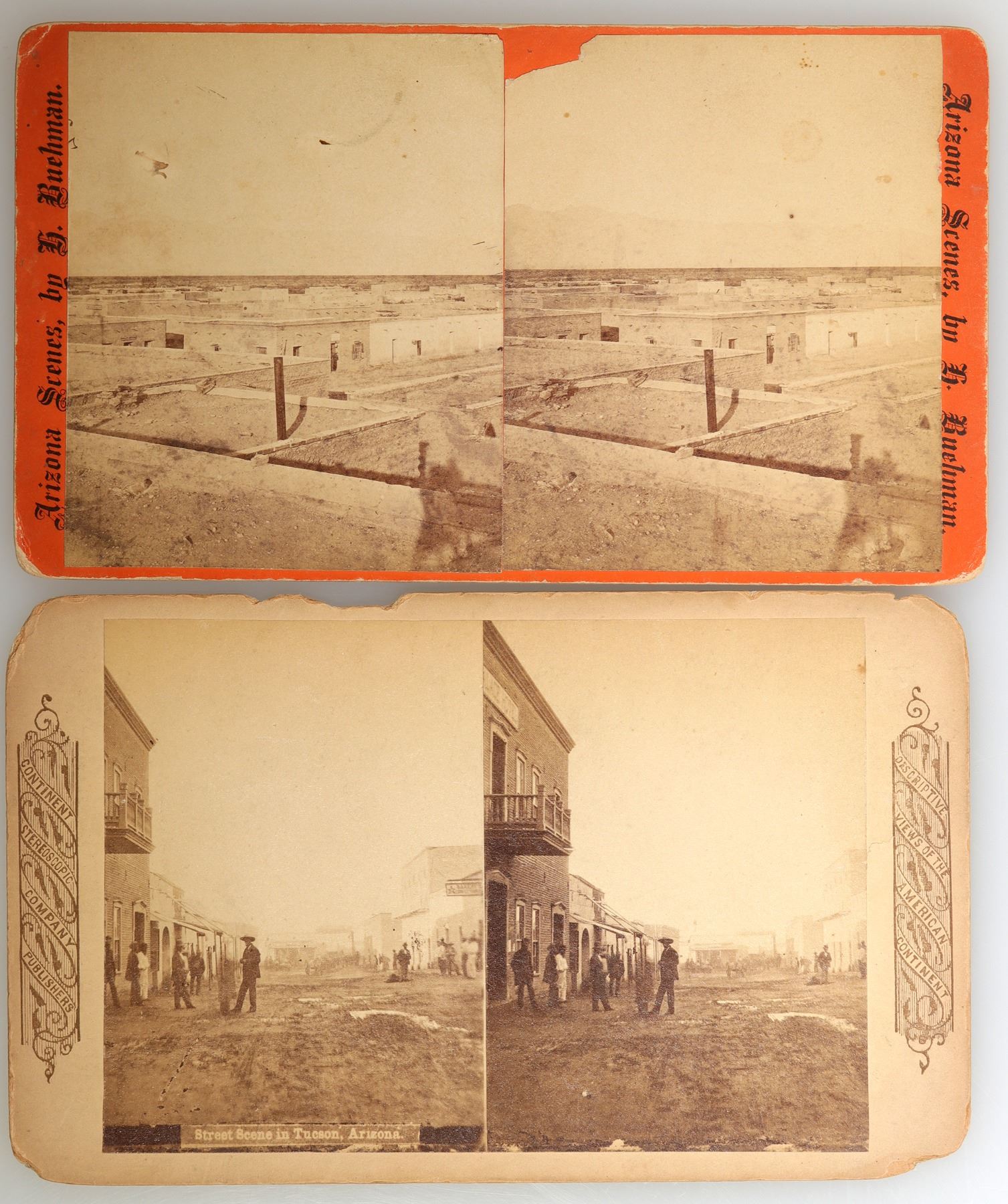 These two stereoviews depict Tucson, Arizona. The first is: "Arizona Scenes by H. Buchman" in the right border, and "Arizona Scenes by H. Buchman" in the left edge. Front is orange mount, back is lavender mount handwritten "17) Tucson-Arizona". From the Arizona Scene catalog C.1878-1881. Not listed in the Rowe catalog. Low color contrast good condition, chip in top right image. (ref. Arizona Stereographs 1865-1930 by Rowe p. 260). 7 in. X 3.5 in. The second card is from the "Continent Stereoscopic Company Publishers" left edge, "Descriptive Views on the American Continent" right edge. "Street Scene in Tucson, Arizona" bottom left image. No date, dirt streets, good color contrast. Ivory front and back mount. C. 1877, not listed by name in the Rowe catalog. (ref. Arizona Stereo graphs 1865-1930 by Rowe p. 267). Good color contrast, chip out of mount top center. 7 in. X 4.25. Arizona