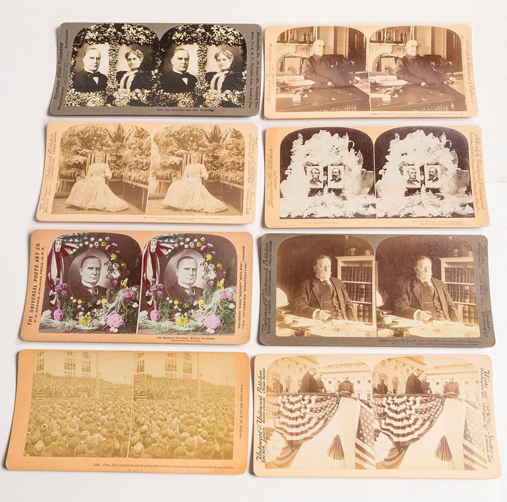 Group of 8 different. 1) Five cards of President McKinley: McKinley and Dewey at Sword Ceremony; McKinley sitting at his desk in the White House; portraits of McKinley and wife; Mrs. McKinley in the Conservatory of the White House; and hand-colored memorial card. 2) Underwood & Underwood card showing President Taft at his desk in the White House, c.1909. 3) Rare 1884 Underwood & Underwood card memorializing Lincoln & Garfield, "The Martyrs." 4) c.1893 card by Kilburn of Cleveland about to press the button at the opening of the Columbian Exposition. (Prag Collection) Date: Location: United States HWAC # 54715