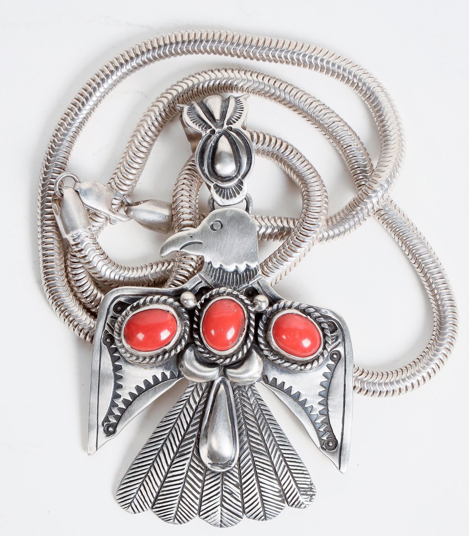 This Eagle necklace was made by Navajo Silversmith Russell Sam, the eagle is suspended by an engraved sterling bale hanging on a 24î sterling silver snake chain, three beautiful pieces of coral highlight the great piece, eagle measures 2 Ωî tall by 2î across, piece is signed Russell Sam. [] [] [] [] []