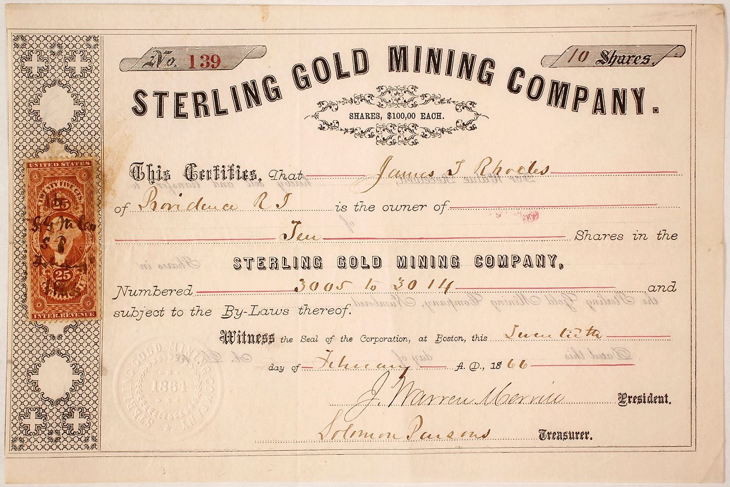 Bobtail Lode, Gilpin County. Rare. Possibly the only known example. Incorporated 1864. No. 139, issued for 10 shares to James J. Rhodes of Providence, Rhode Island on Feb. 20th, 1866. Signed by J. Warren Merrill as president and Solomon Parsons as treasurer. Not cancelled. 25 cent IR adhesive stamp attached at left. Folds, some stains. It was very difficult to find information about this mine! Not in Filer. From a Report Supreme Court Cases in Colorado, we found a lawsuit filed in Gilpin County against this company which provided more details. Mrs. Crandall, widow, is suing the company because she believes the property was rightfully hers following the death of her husband in 1860, based on the laws of Kansas Territory. Her husband's claim was on the Bobtail Lode in Gilpin County. She is also arguing that that portion of Gilpin County was within the bounds of Kansas Territory in 1860. The court ruled against her. From this clue, we were able to use The Gold Mines of Gilpin Counties, 1876, to confirm that the Sterling Mining Co. owned 66 2/3ft. on the Bobtail Lode in 1864. After 1869, all of the companies on that lode, including the Sterling, consolidated into the Bobtail Company. J. Warren Merrill, an Eastern capitalist, was also treasurer for the Boston & Colorado Smelting Company in 1867. Date: Location: Gilpin County, Colorado HWAC# 60637