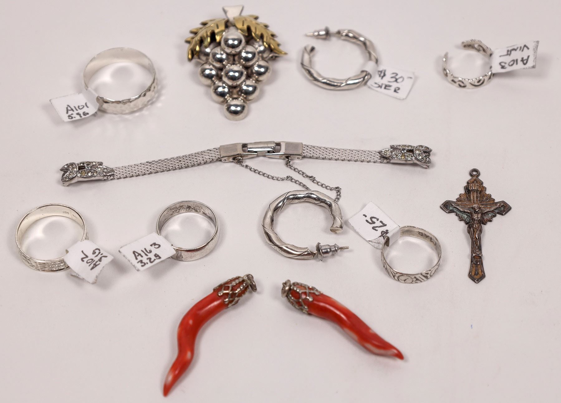 Two coral pendants; silver hoop earrings; five silver rings; crucifix; grape cluster; tiny bracelet. City: State: Date: