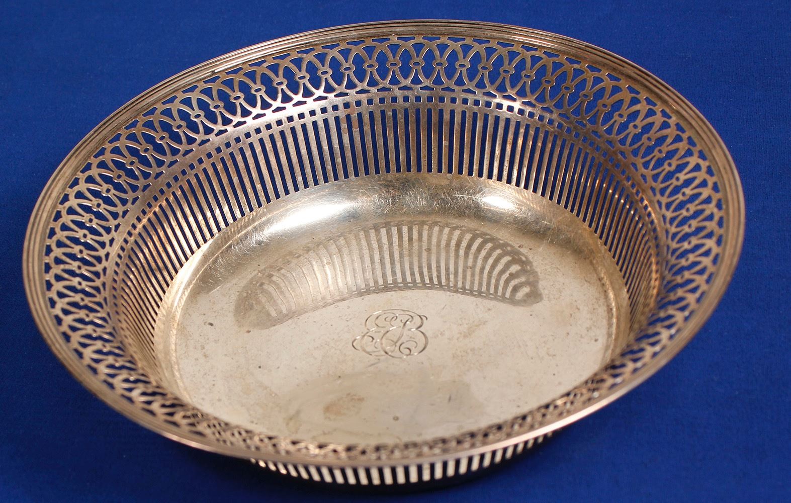 Unique and delicate looking bowl. Fancy cut edges! 9" diameter. Inside engraved "E E B." Bottom hallmarked "Sterling / made for Tiffany & Co. / 3571." Good condition. Date: Location: HWAC# 58201