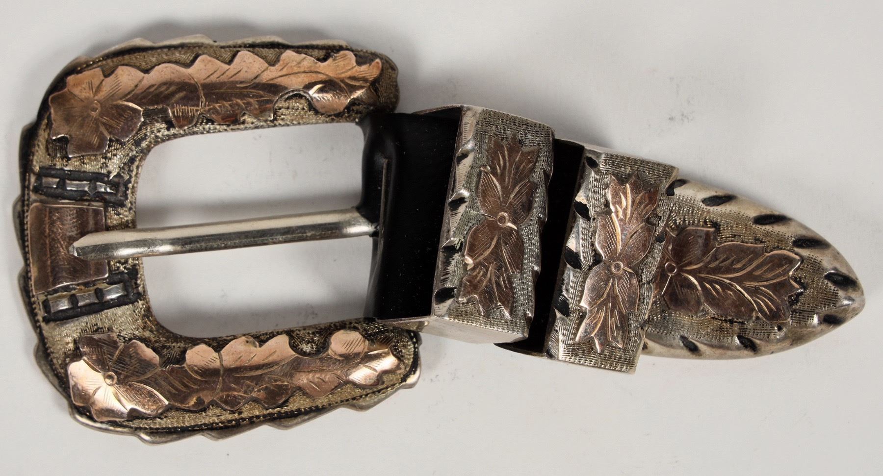 In original box from Eddie's Silver Tamagno 94 Colonia Peralvillo Hecho in Mexico. Four pieces: belt buckle, two stays, and tip. Sterling silver accented in 14 carat gold. Total weight 76 grams.