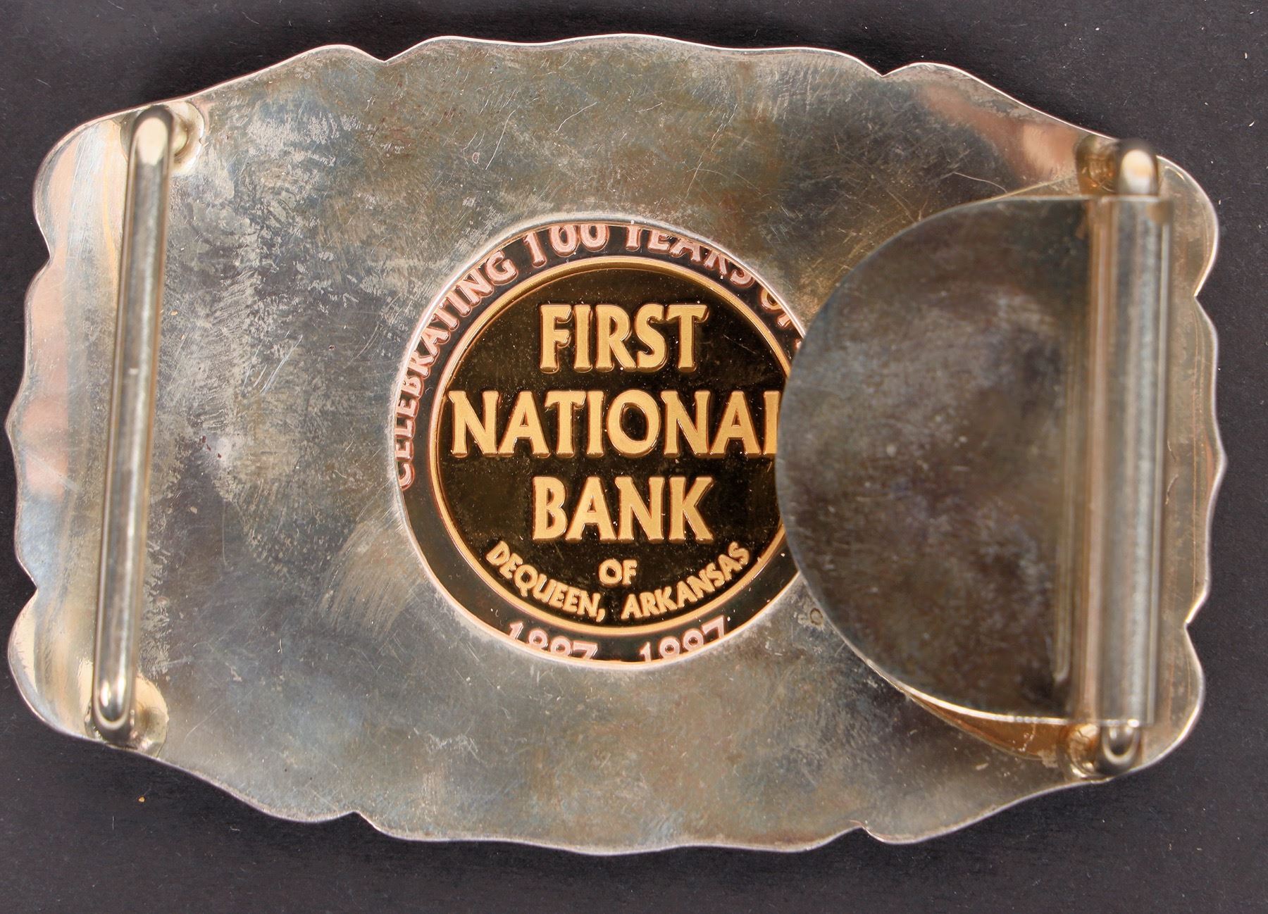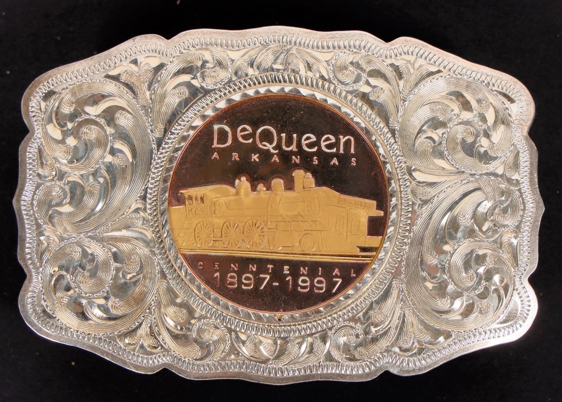 Sterling silver belt buckle, 106 grams, 3.5" x 2.5". Marked on rear, "Diablo (insignia)/Sterling/Made in USA." Beautifully engraved silver. Copper and gold colored commemorative coin inset, 1.5" diameter, embossed on front "DeQueen/Arkansas/Centennial/1897-1997," with an enameled train, and on rear, "Celebrating 100 Years of Service/First/National/Bank/of/DeQueen, Arkansas/1897-1997." This belt buckle Fits Standard 1.5" Snap on Belts.