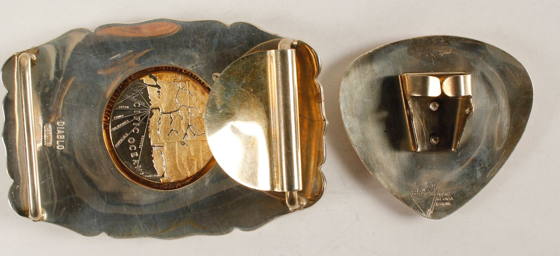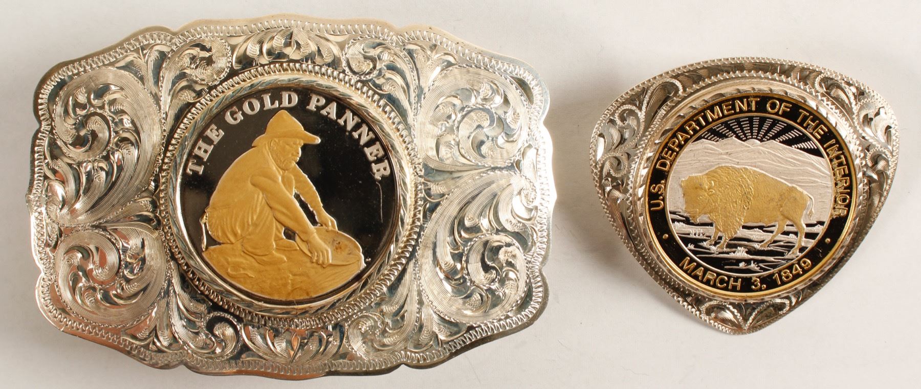 Ornamented Sterling Silver belt buckle and matching bolo tie, each inset with one-troy-ounce 999 Fine Silver bullion coin from Northwest Territorial Mint. Buckle has The Gold Panner design which appears to be selectively gold plated; bolo has the bison seal of the Department of the Interior. Bolo has no leather in this set. This lot comes from the liquidation of Northwest Territorial Mint. City: State: Date: HWAC# 79531