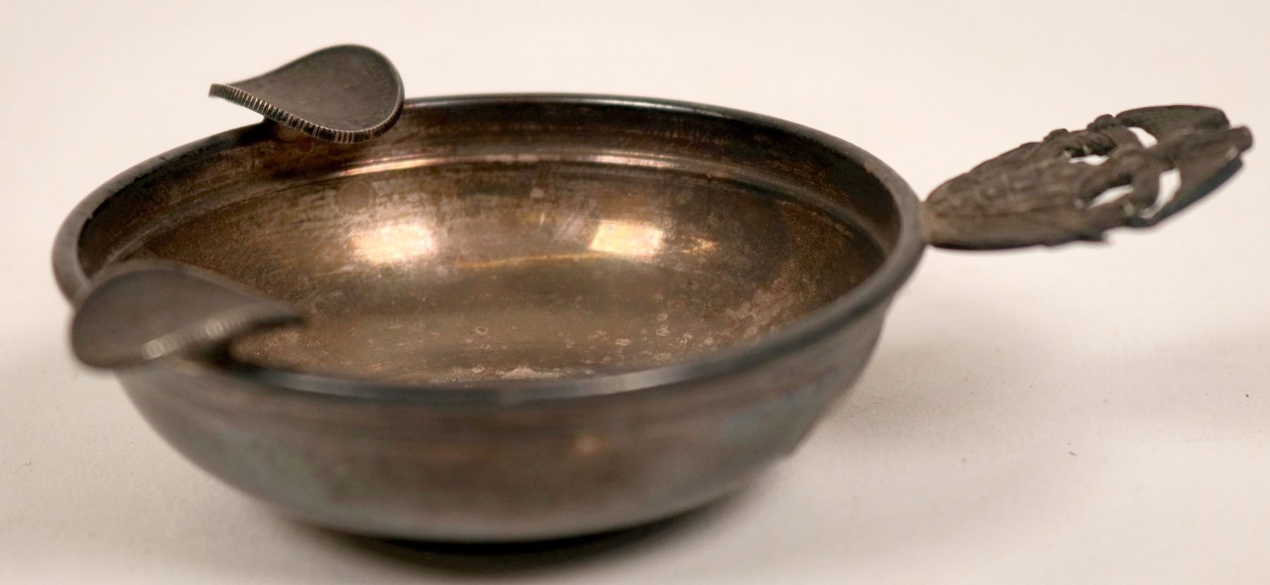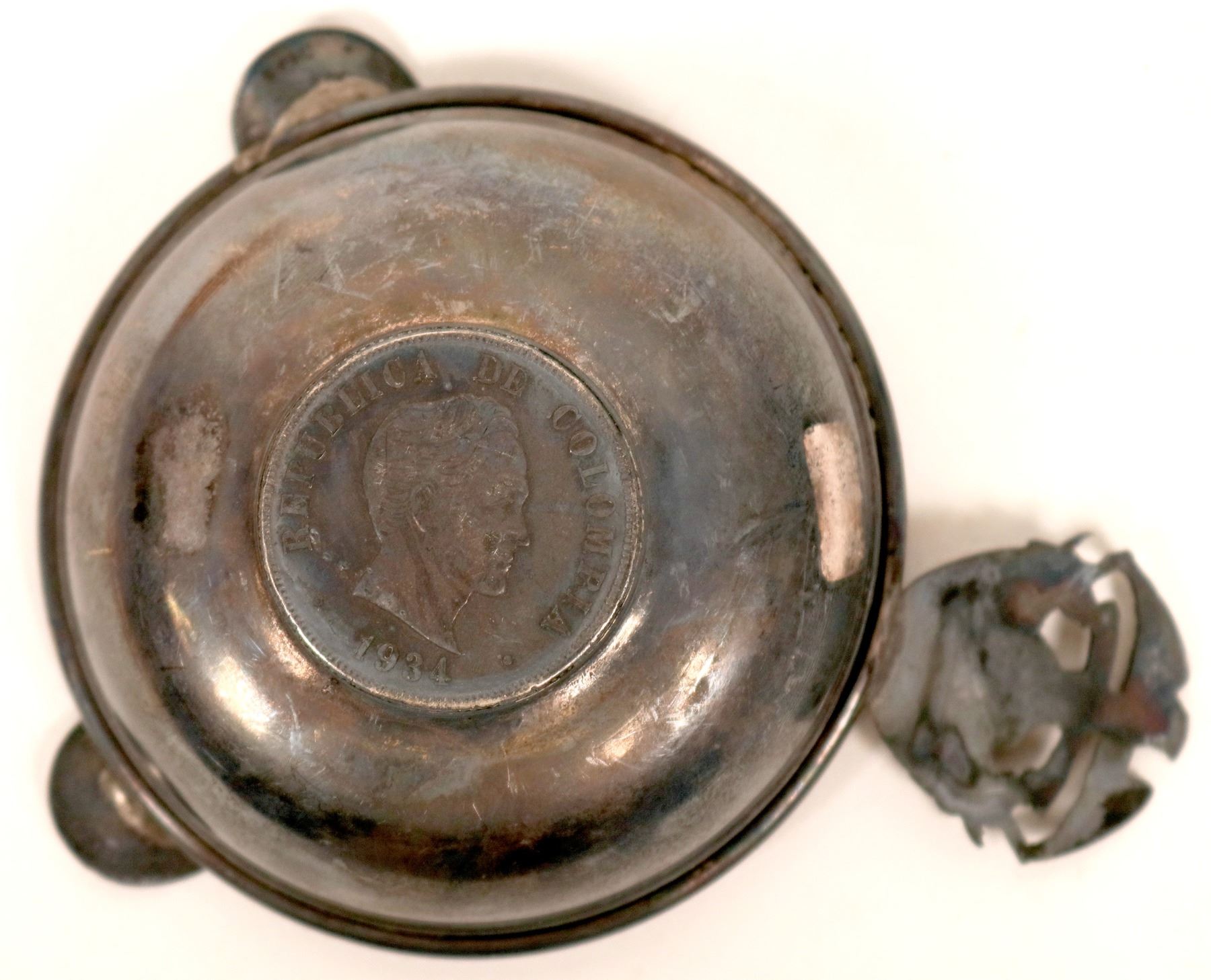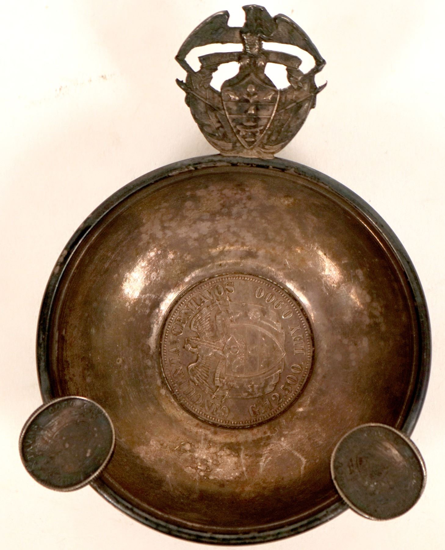 Cincuenta Centavos 1931 silver piece from the Republic of Columbia at the base of this 3 inch wide ashtray with two diez centavo coins on the rim. About 1/2 inch tall, national seal at the top.