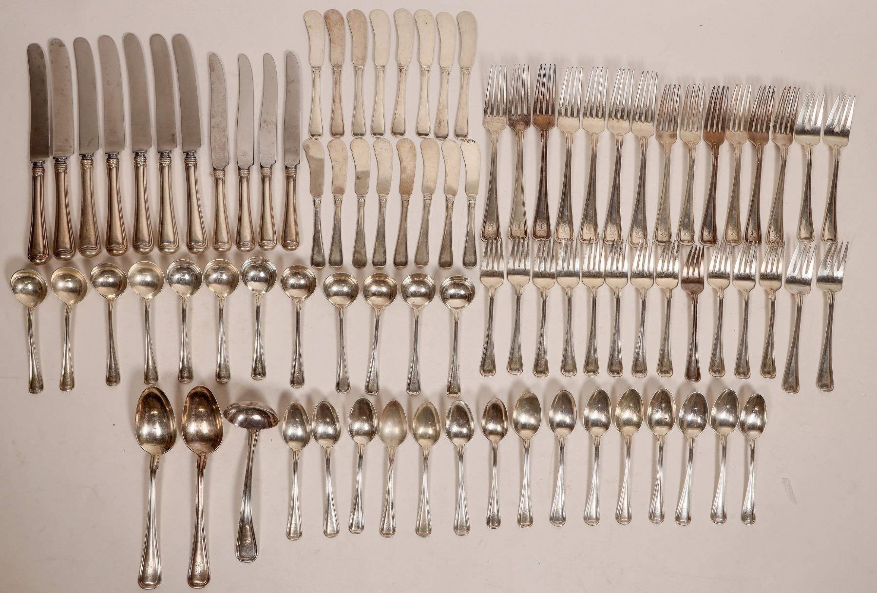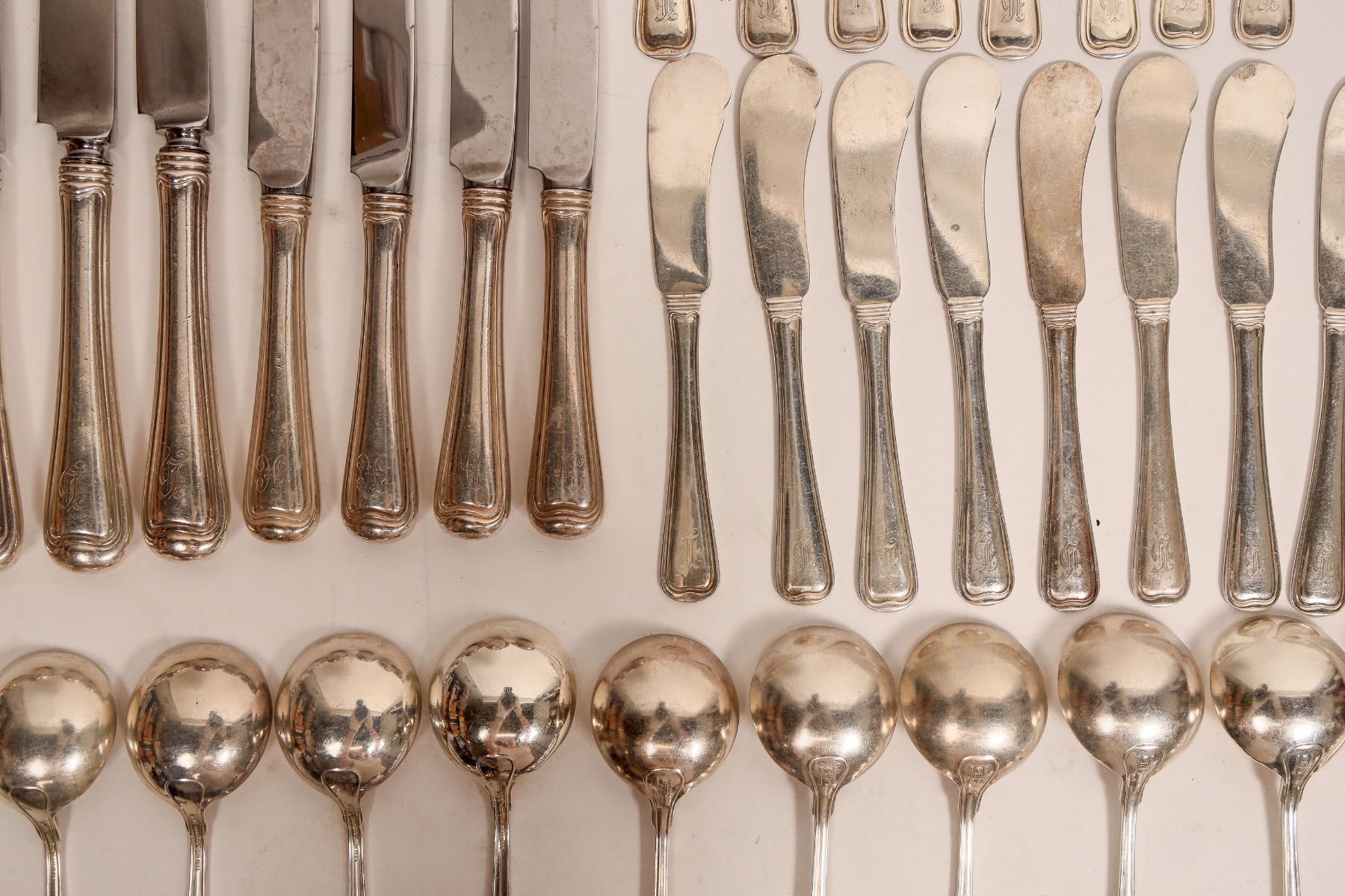 Large group of mixed sterling silver flatware from the historical Holabird family of California. The group includes soup spoons, butter knives, salad forks, dinner forks, knives and some serving pieces. The net silver contained is 89.52 troy ounces. The following engraved initials are for the following families: WHH William H. Holabird; HGH Harry Gillette Holabird; TMH Timothy Marshall Holabird. WHH was a well known southern California real estate developer, acquisitions agent for SPRR, and general project financier, such as for the famous Del Coronado Hotel in San Diego. Civil War veteran, also designed at least two guns early in his career.