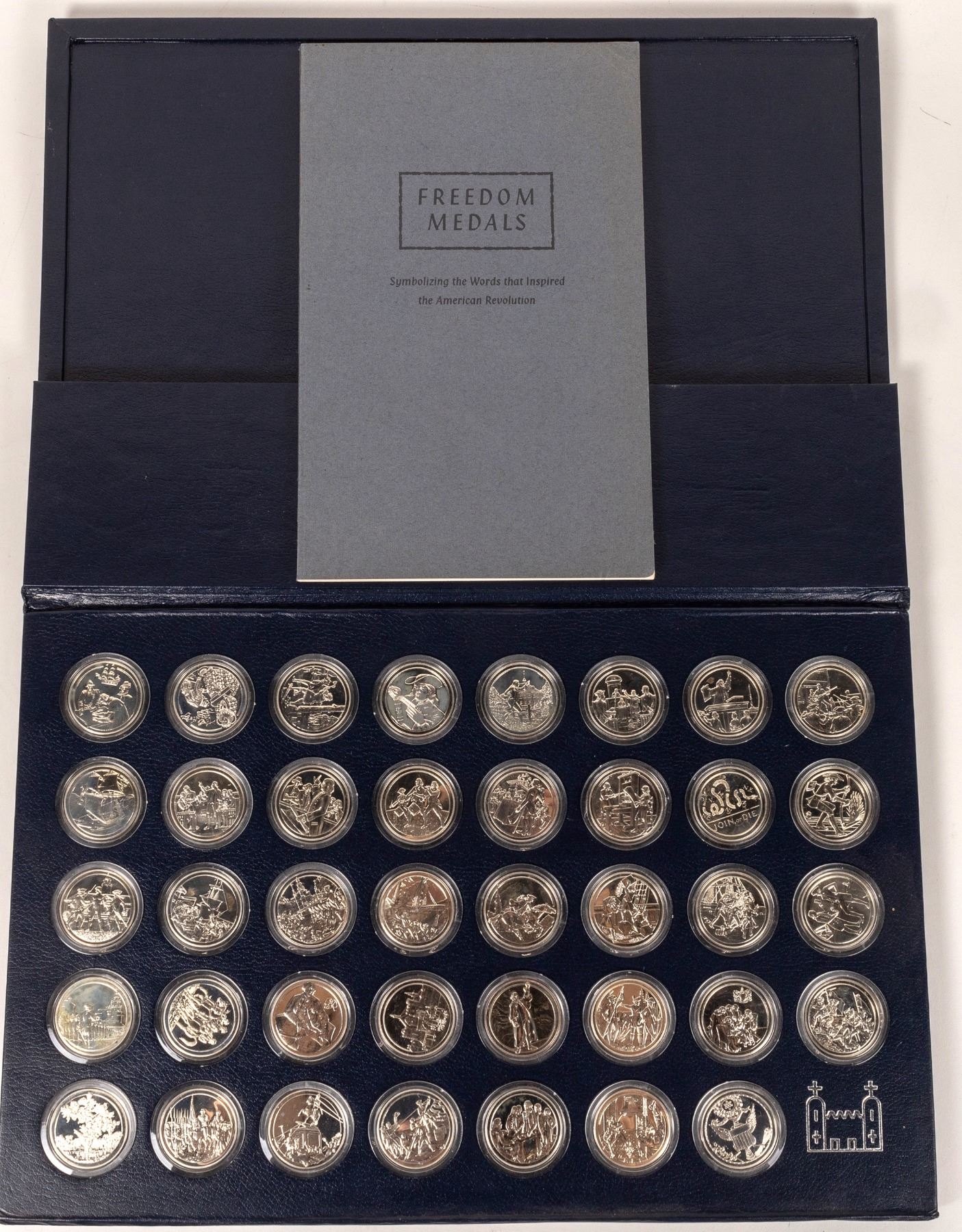 Issued by the American Express Company, produced at the Royal Mint of England, 39 sterling silver Freedom Medals symbolizing the words that inspired the American Revolution. Display case is 19 x 13 inches, and includes a 68 page brochure explaining the history of each quotation. Medals are 39 mm and about one ounce silver. All together the medals weigh a total of 42.78 ounces of Sterling Silver. These sets were made in 1973 and available to American Express card holders.