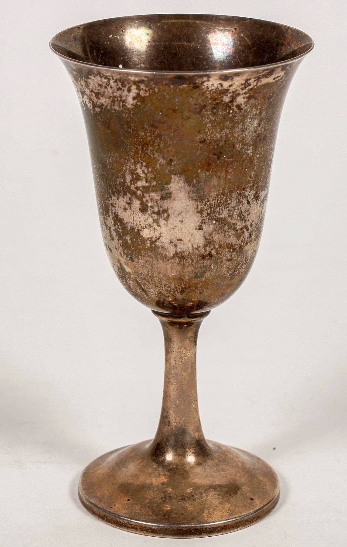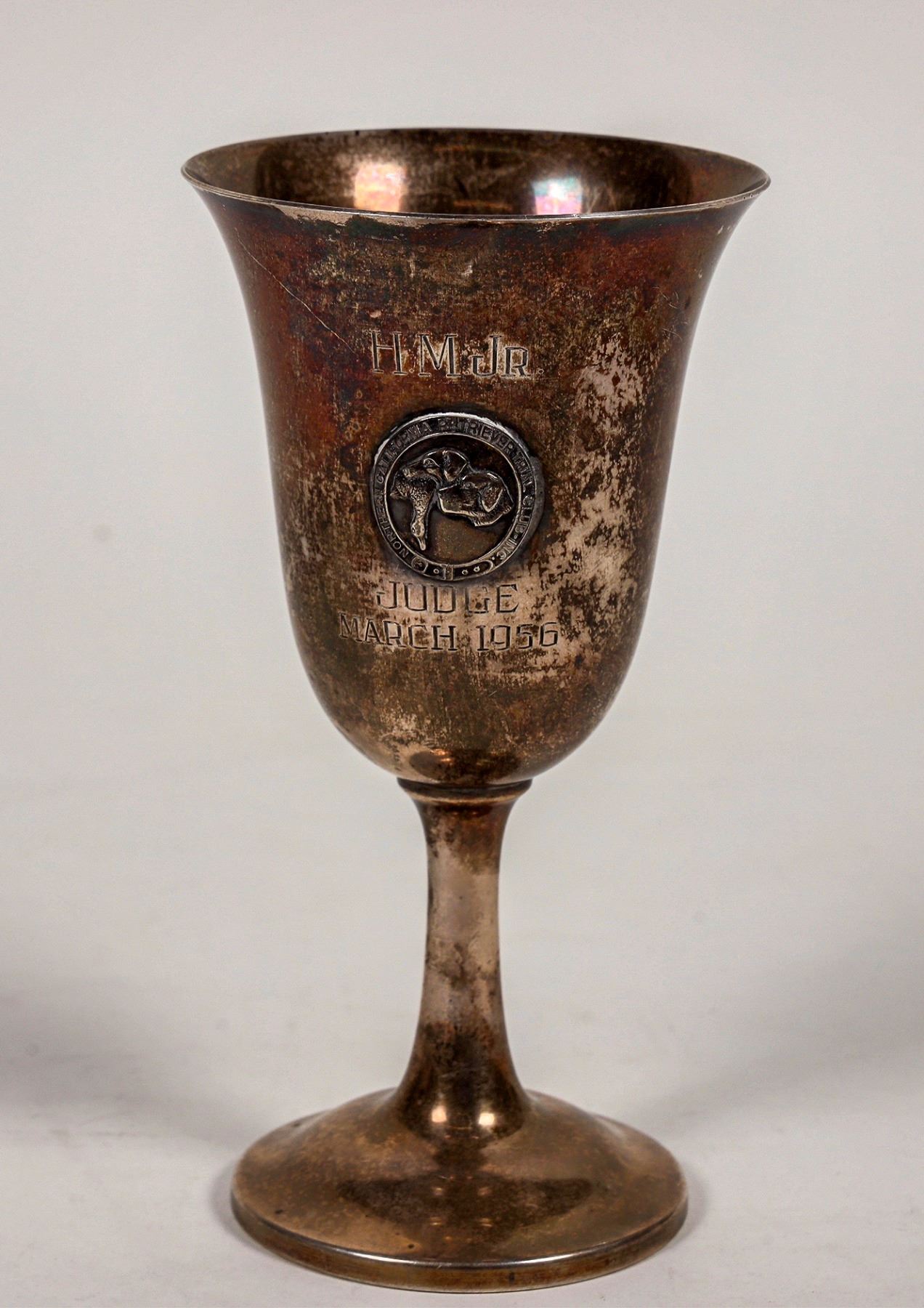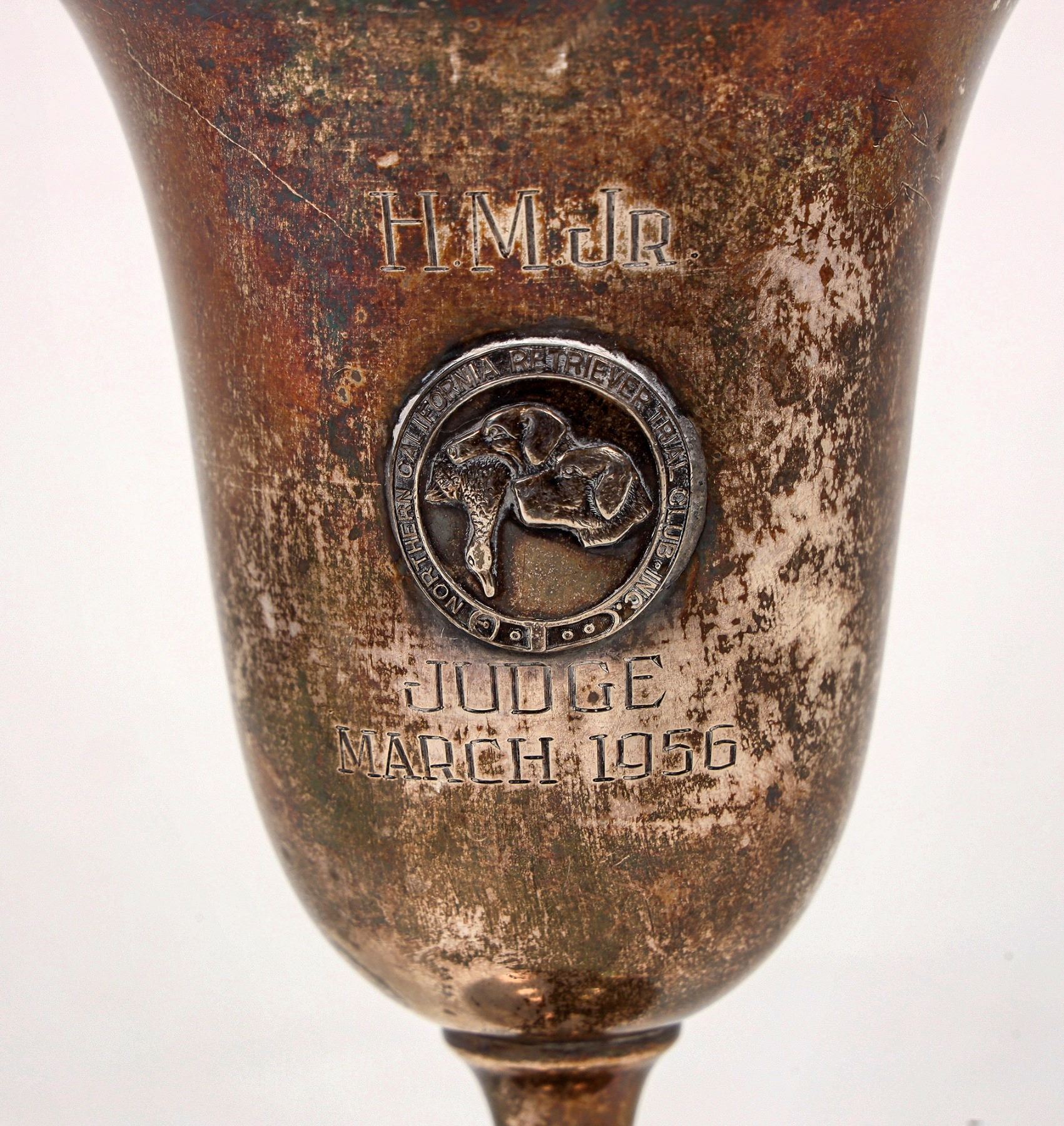 Sterling silver by Wallace goblet. Embossed HM Jr./Judge/March 1956 with silver Northern California Retriever Club Inc. medallion added. 4.1 Troy oz. silver contained. $130 melt.