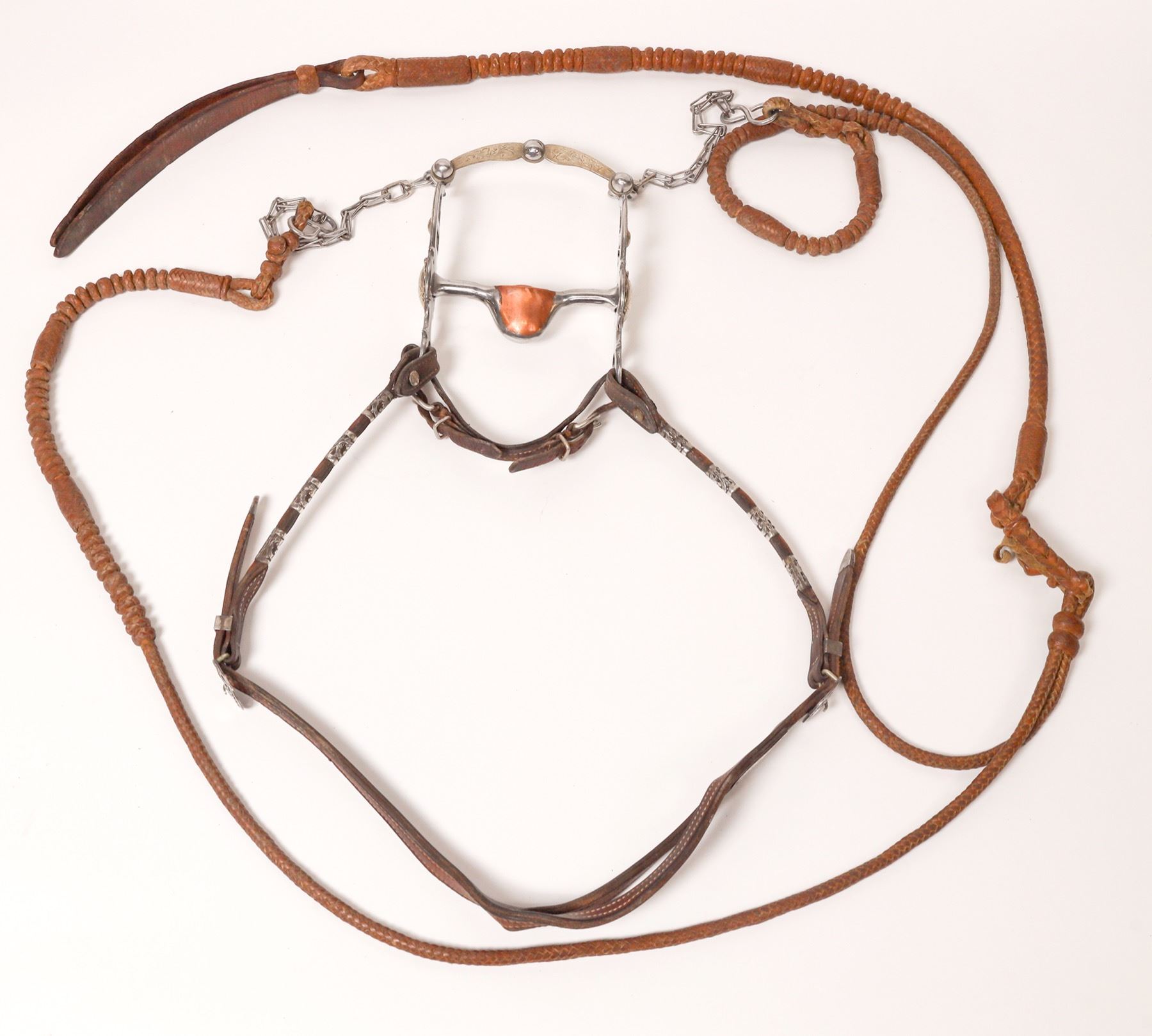 Sterling Silver Headstall made by Vogt with Silver Bit w/ Hooded Roller and Romel Reigns. Fancy Western scroll work on silver.