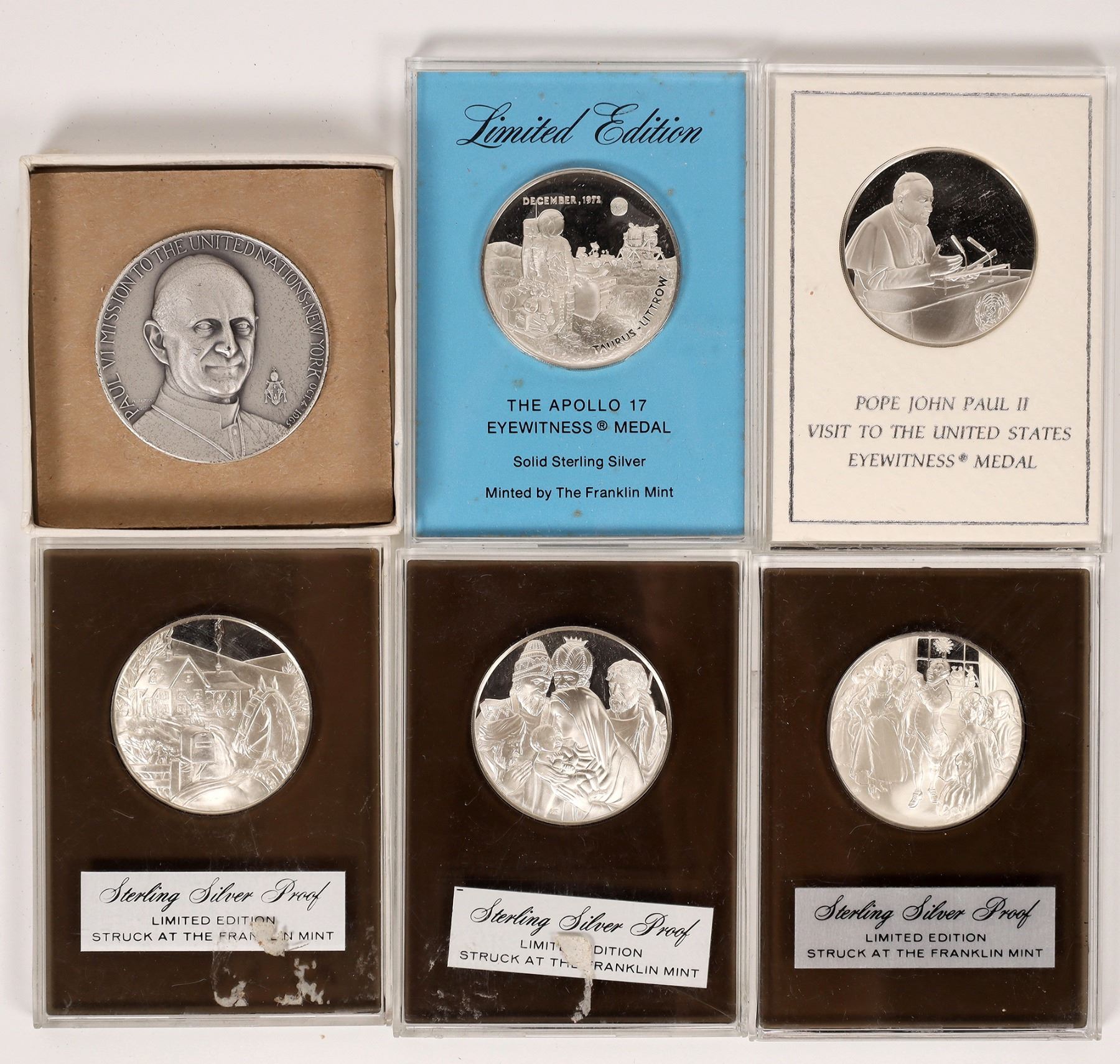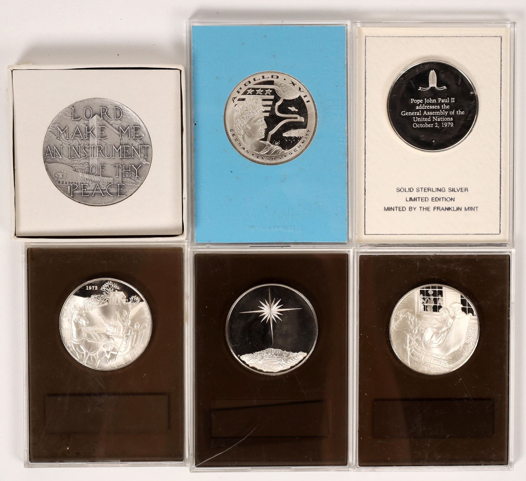 Lot of six sterling silver medals, five from Franklin Mint: Apollo 17; (2) 1972 Christmas; 1975 Christmas; 1979 Pope John Paul II Visit to the United States. Medallic Art: Pope Paul VI.