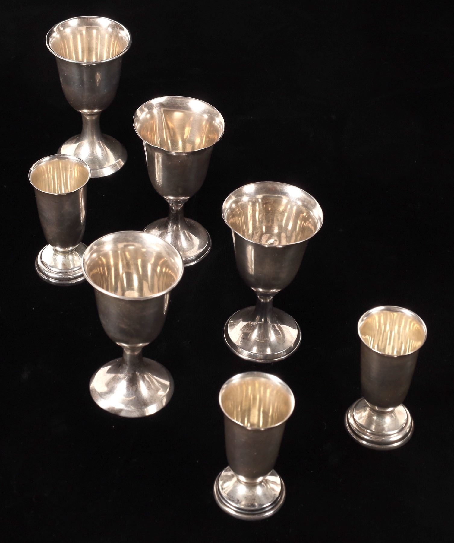 7 unusual Sterling silver shot glasses with weighted bottoms, about 2.25x1". At least 4 oz. of silver.