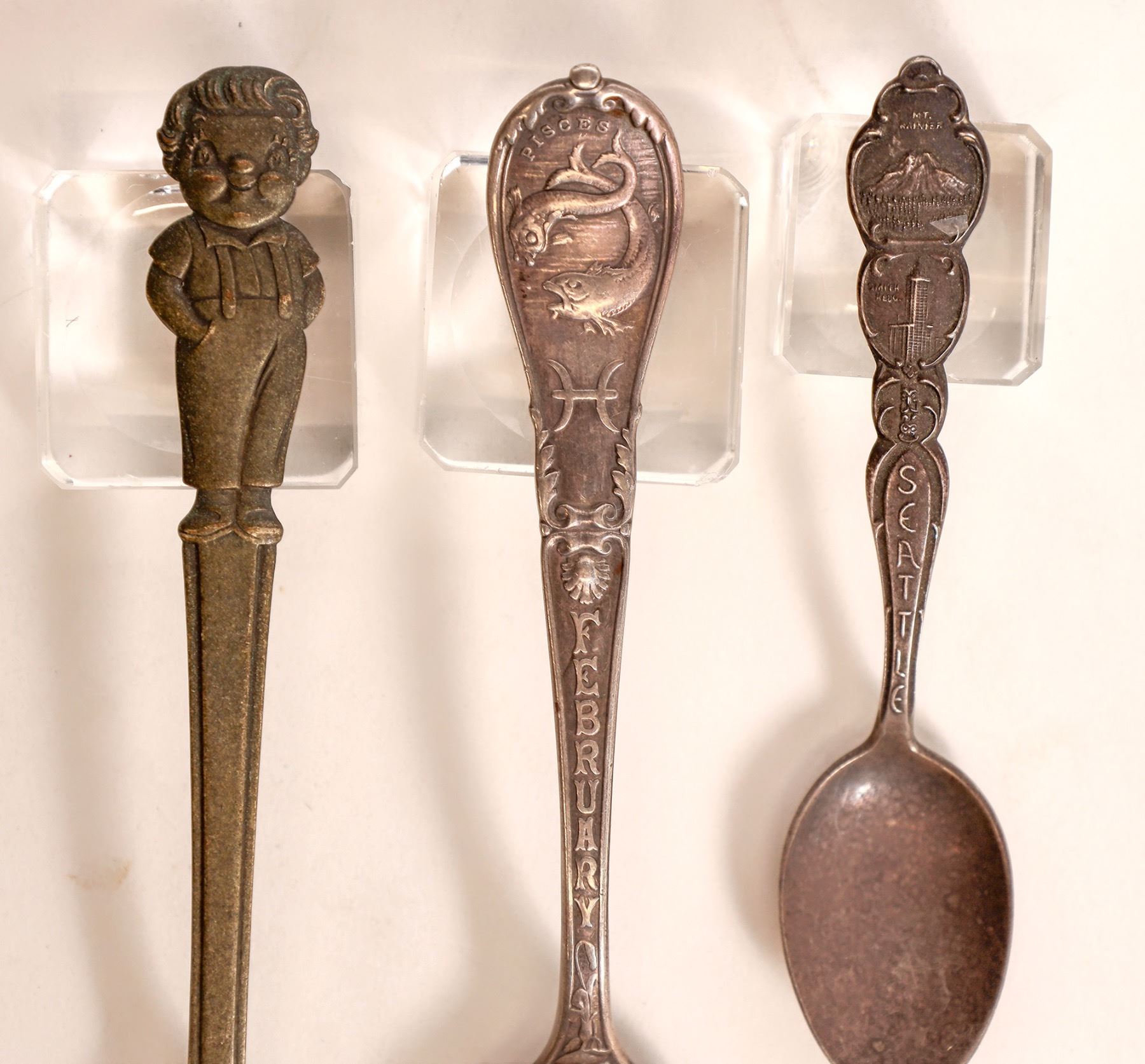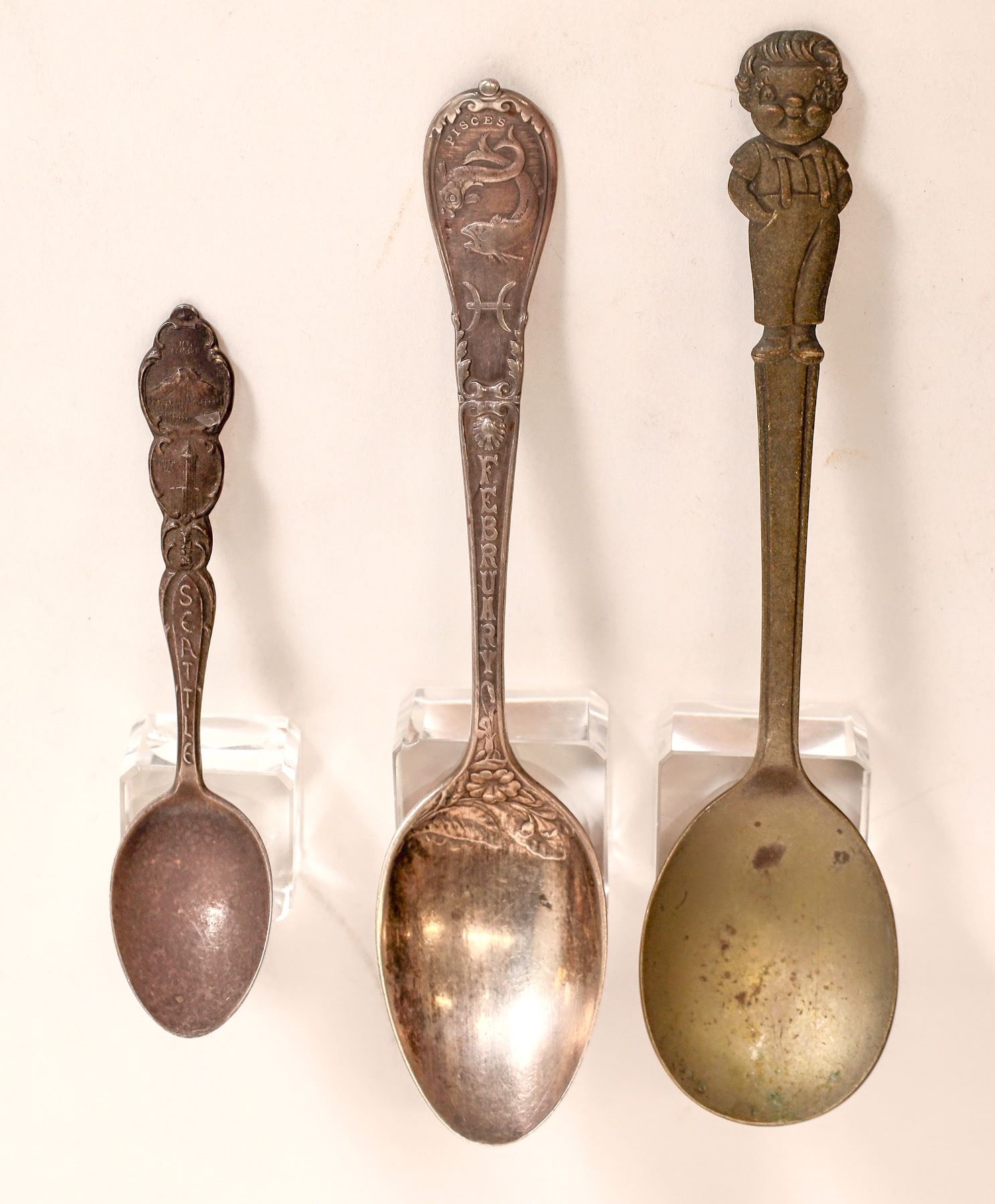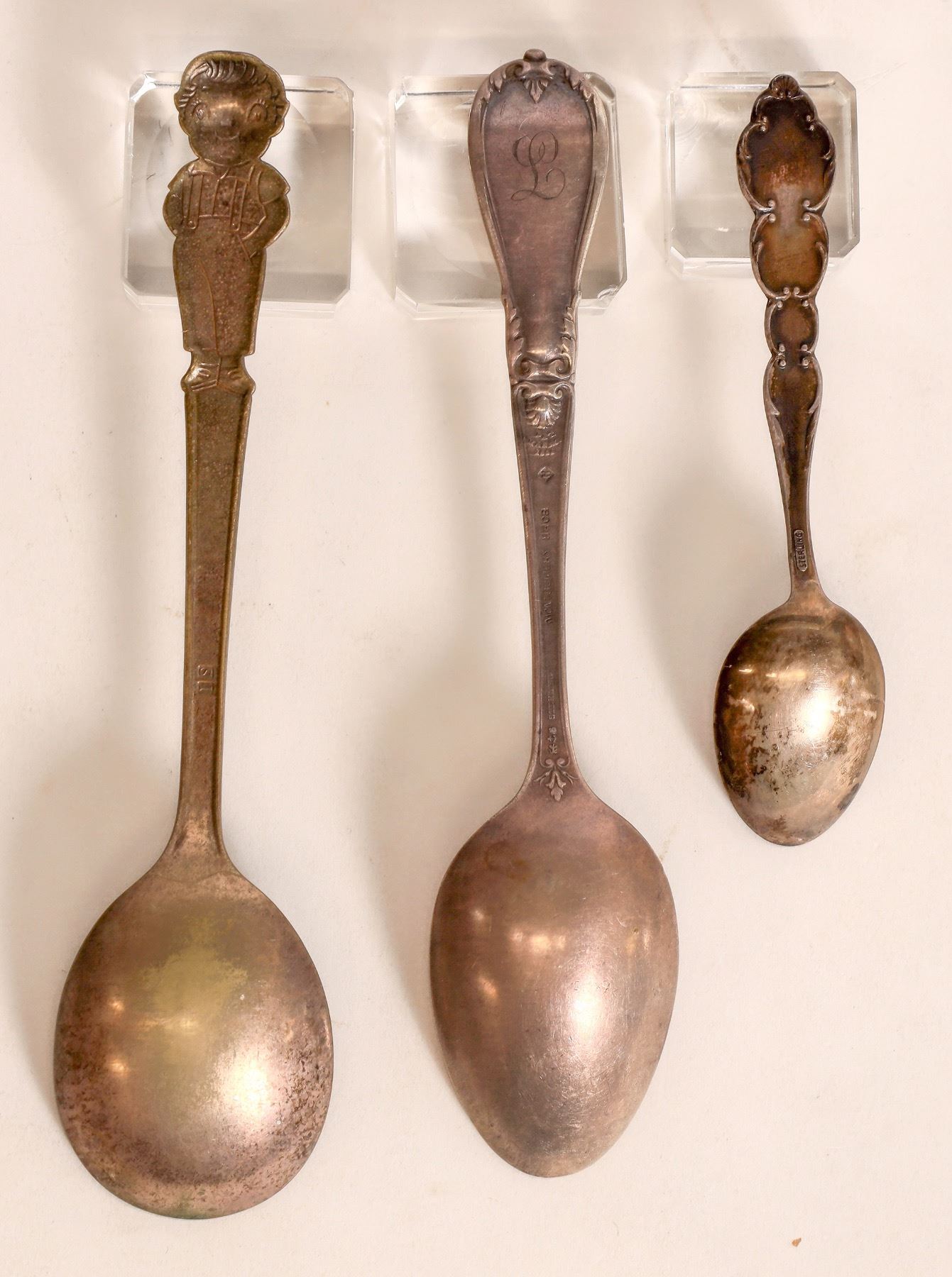 3 Sterling spoons. Seattle, February, boy with suspenders. 3.75-5.75".