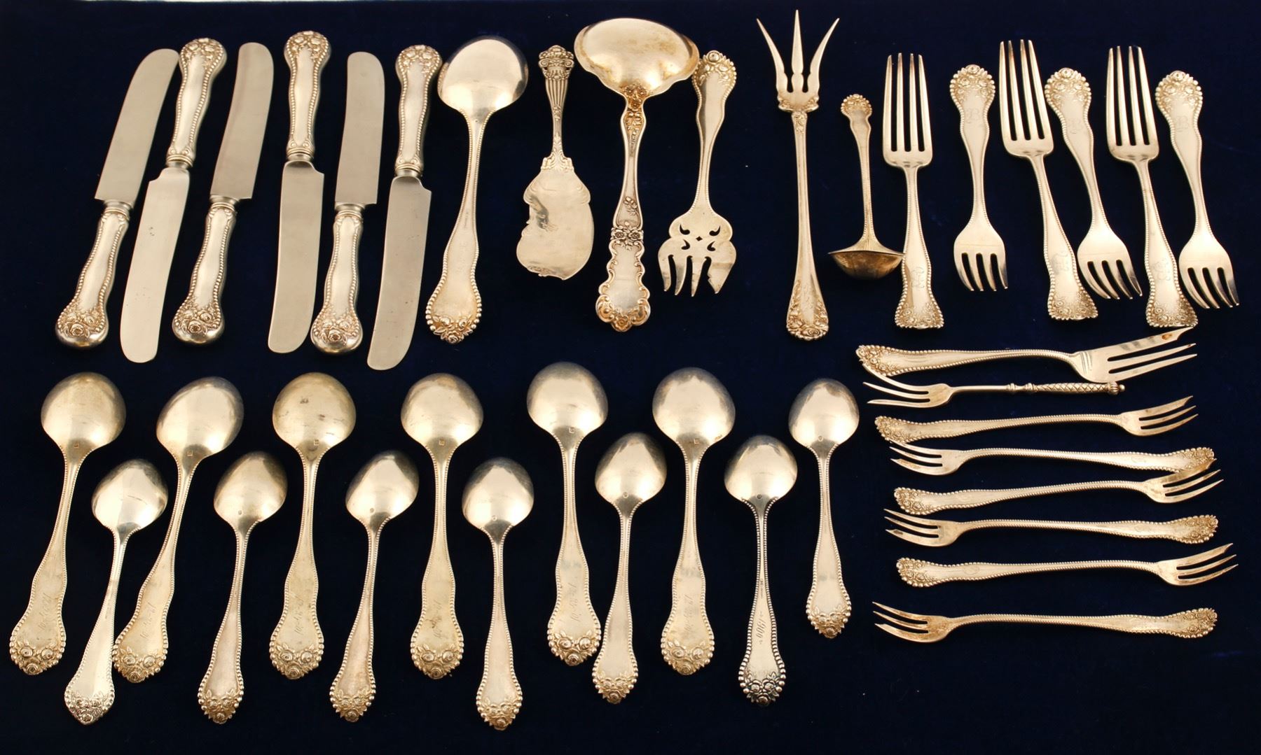 Pattern B, 6 dinner forks, dated 12-24-2001, engraved "B" Troy 7.44; 7 sterling silver small spoons engraved Cowell & Hubbard, Troy 5.08; 1 large sterling silver spoon, patent 1900, 8.5" x 2.25", 7.25 Troy; 6 Stainless steel butter knives; other pieces, same pattern, not engraved "B", Forks, 8 misc., several serving pieces, 6 sterling silver cocktail forks, 1 large sterling silver fish spoon, patent 1898, 7.25" x 1.25", 1.42 Troy. More than 21 ounces of silver.