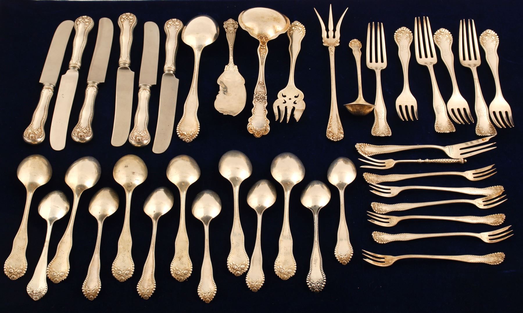 Pattern B, 6 dinner forks, dated 12-24-2001, engraved "B" Troy 7.44; 7 sterling silver small spoons engraved Cowell & Hubbard, Troy 5.08; 1 large sterling silver spoon, patent 1900, 8.5" x 2.25", 7.25 Troy; 6 Stainless steel butter knives; other pieces, same pattern, not engraved "B", Forks, 8 misc., several serving pieces, 6 sterling silver cocktail forks, 1 large sterling silver fish spoon, patent 1898, 7.25" x 1.25", 1.42 Troy. More than 21 ounces of silver. State: City: Date: 1898 HWAC# 76200
