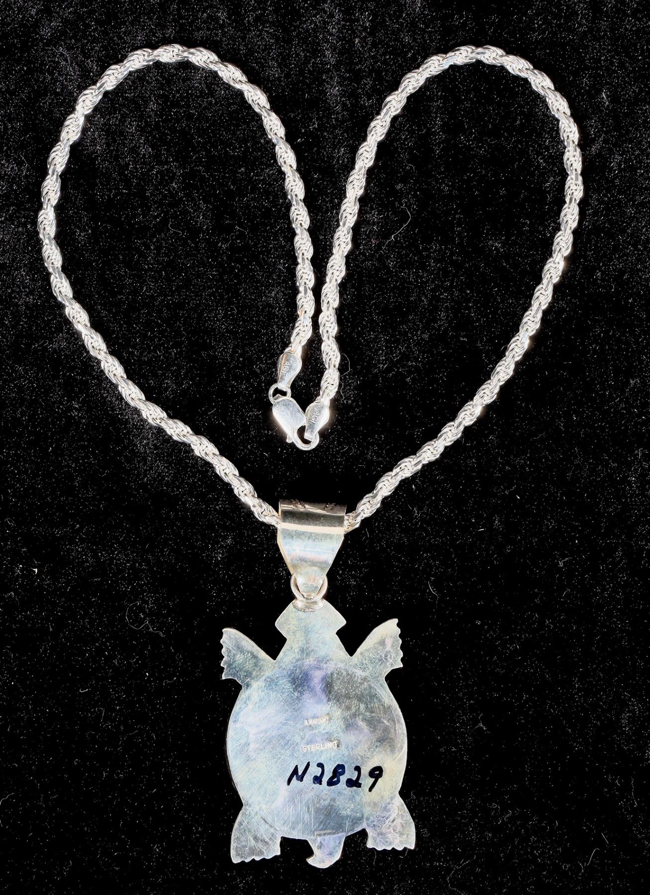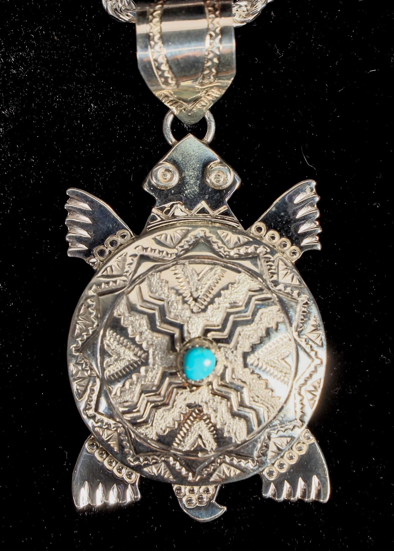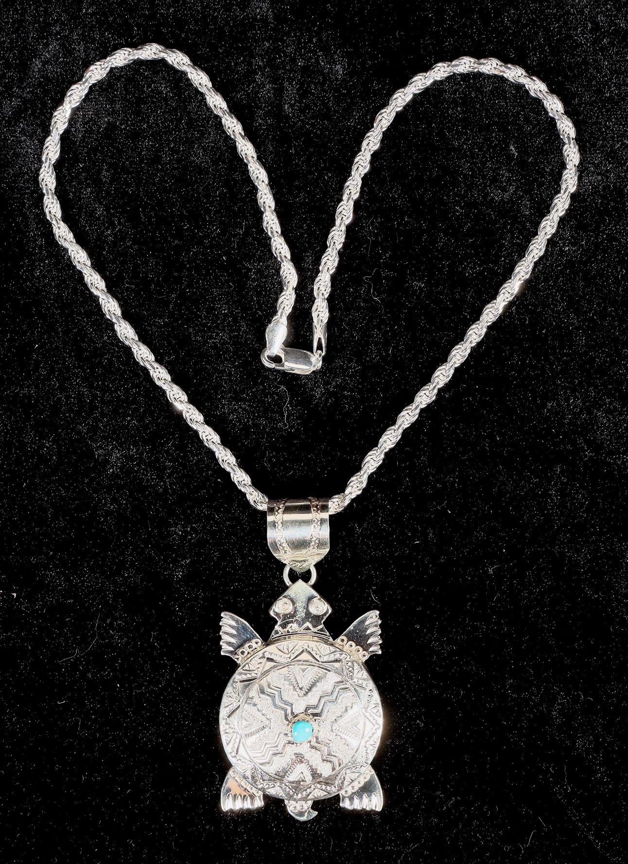 This is a very nicely done sterling silver turtle pendant with a single turquoise spot on the shell, the turtle measures 1 .5" by 2 ¼" the piece is suspended from an 18" medium rope style sterling silver chain, the hallmark appears to be A. Marian.