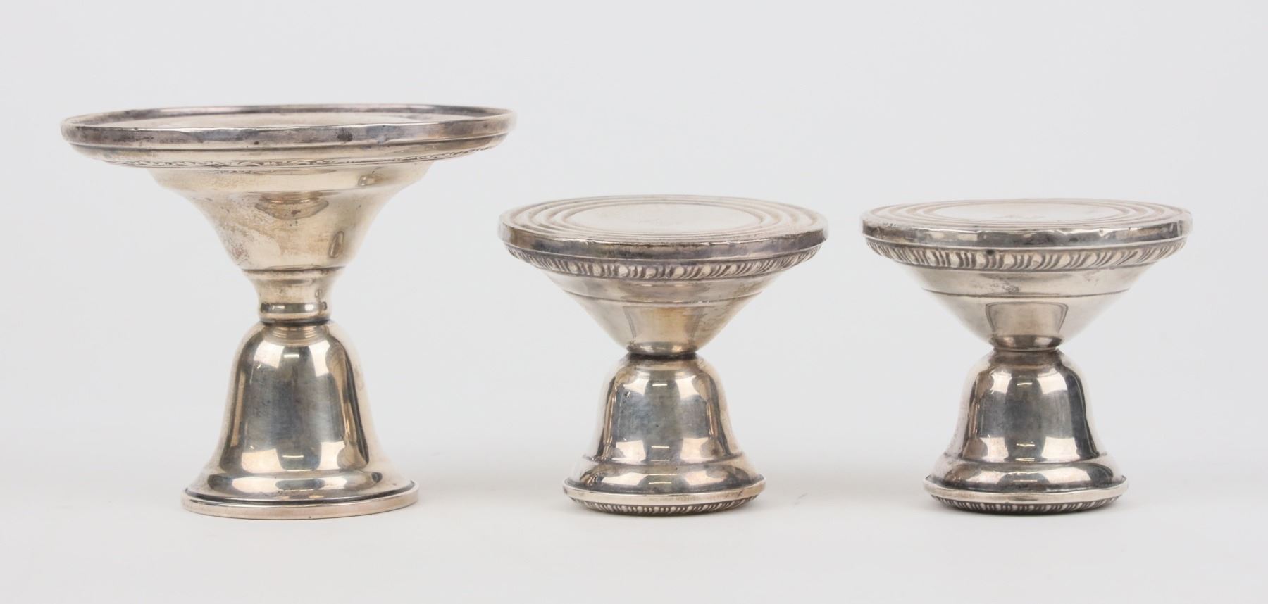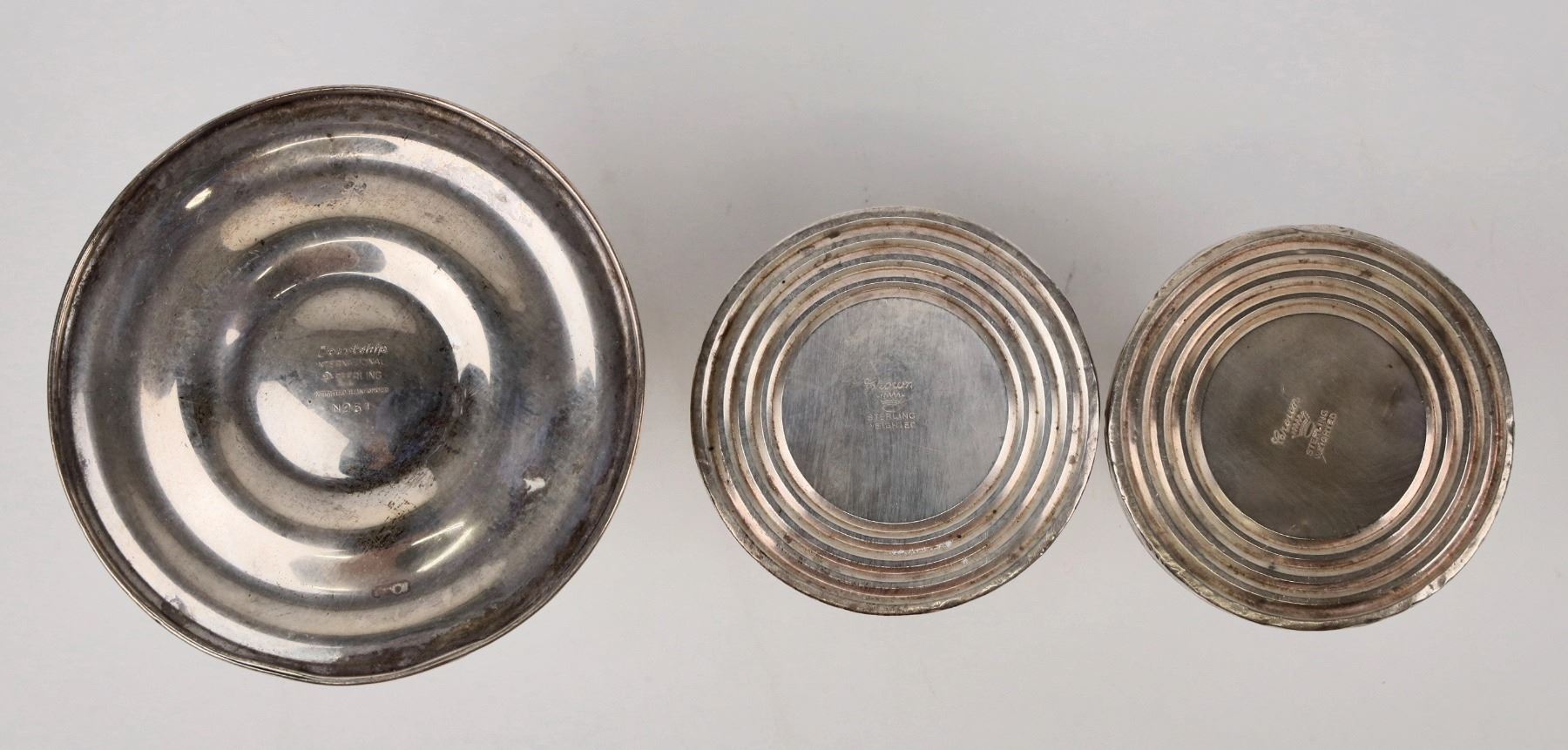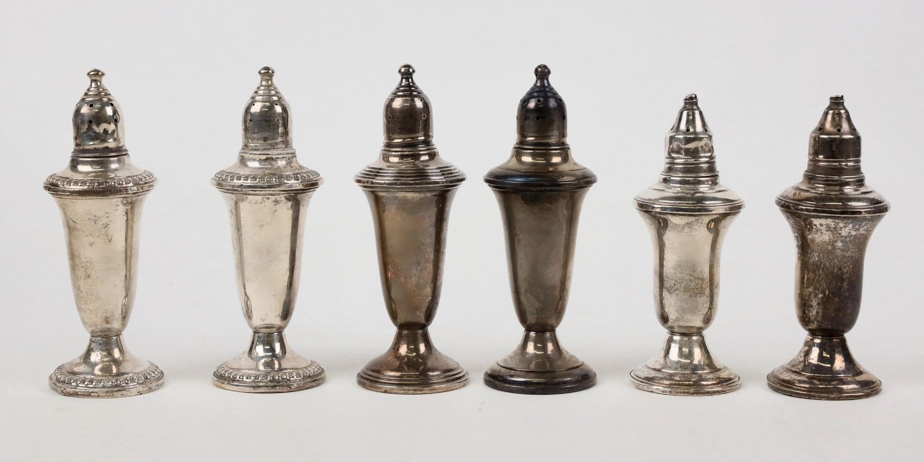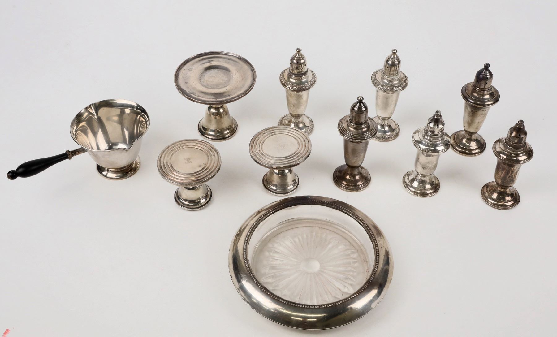 Eight pieces of weighted sterling silver, all from Massachusetts manufacturers. Three short candlesticks, six salt-pepper shakers(two are about 4.5" tall, four are about 5" tall), silver edge ashtray (6.5" diam), handled sauce pouring cup (3.5" diam). Reed & Barton, Etc. All fine condition, approximately. Some Shakers have base damage. guess at about 7 oz of sterling - each with weighted bottom, so difficult to tell the silver weight.