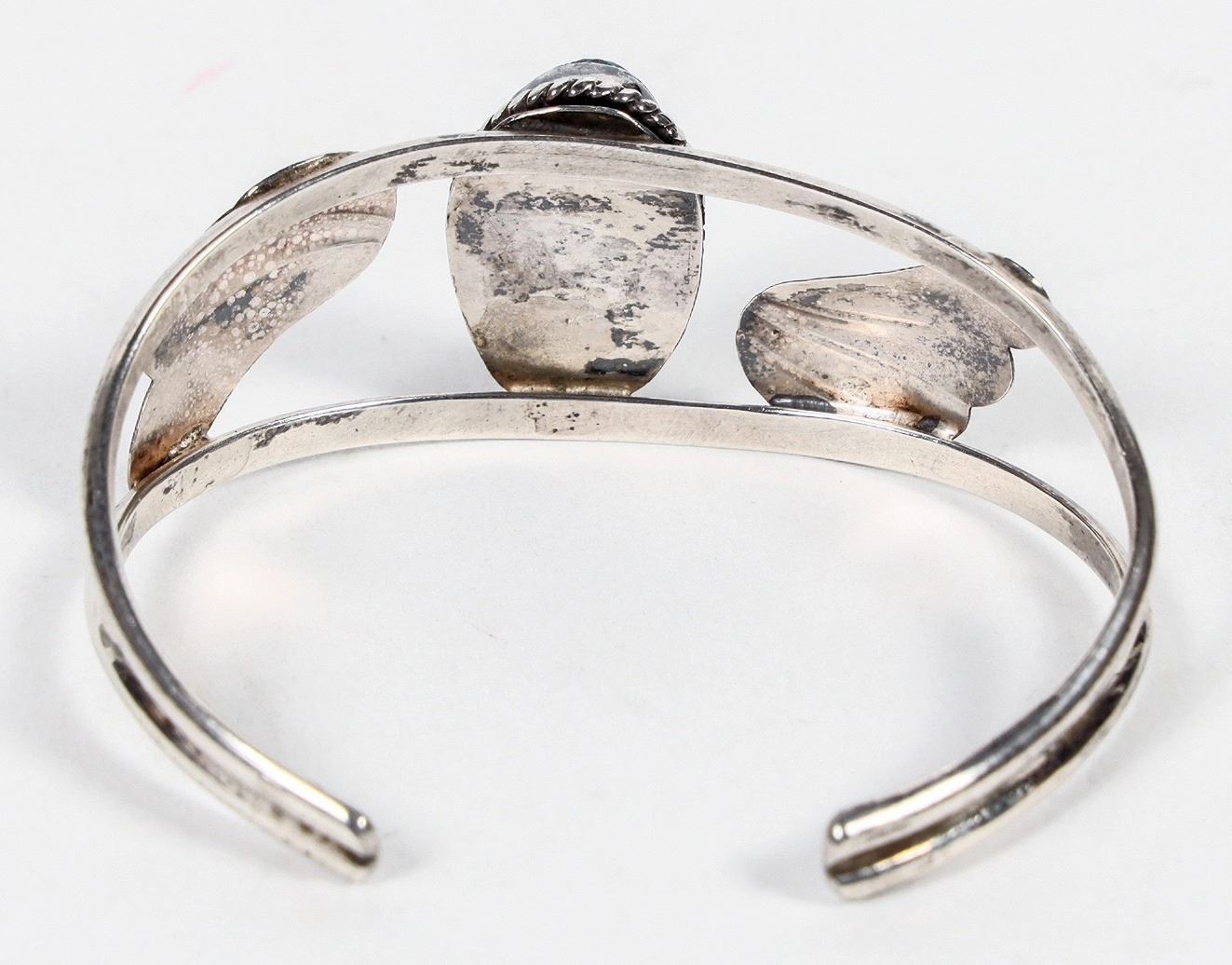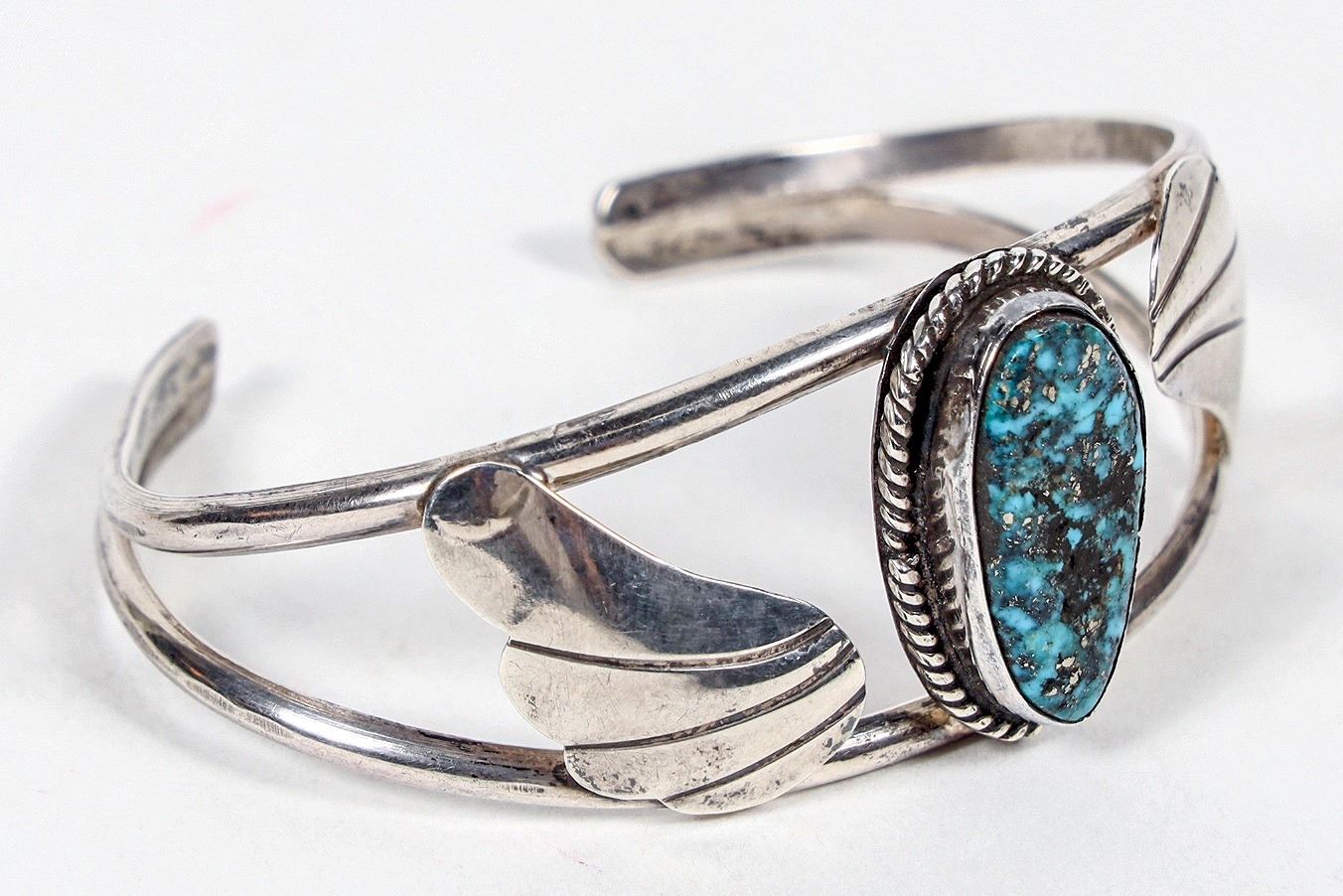 Spiderweb stone, sky blue, likely turquoise, stone approximately .75" long, .4" wide. Bracelet circumference measures 6". Width of bracelet tapers from 1" to .25". Good condition, see photo.