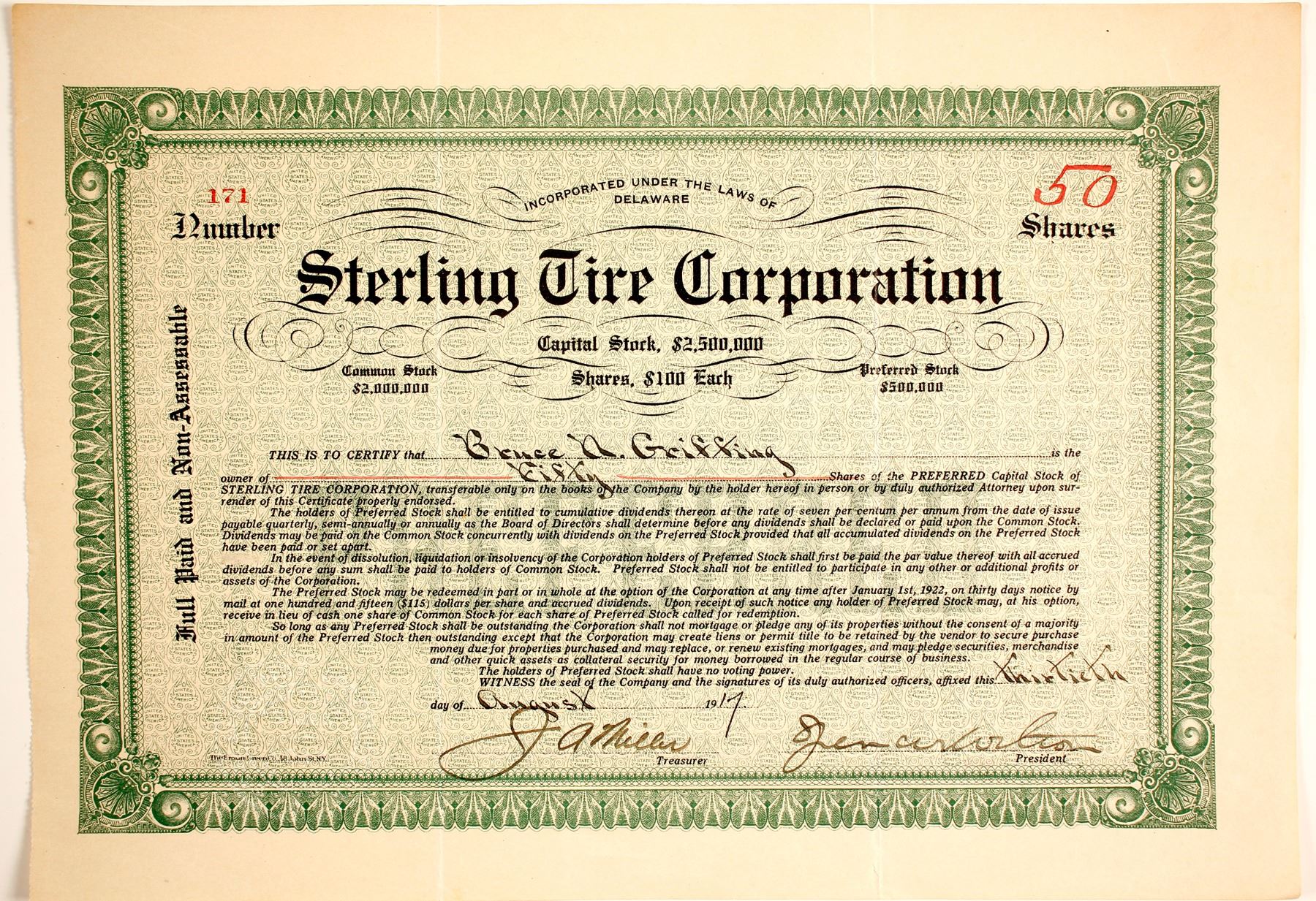 50 shares of Sterling Tire Corp cert. # 171 issued to Bruce N. Griffing on Aug. 30, 1917. Signed by J. A. Miller, treas. Green border, background and company seal. Inc. DE. Sterling Tire Corp. is a New York Foreign Business Corporation filed on Nov. 14, 1918. Printed: The Broun-Green Co., 48 John St. NY. . State: Delaware City: Date: