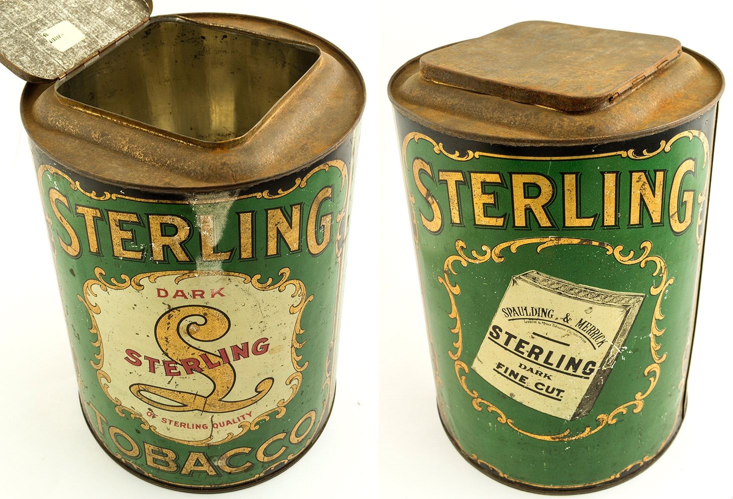 Sterling Tobacco Can, approx 11.5 x 8.5 inches. Spaulding and Merrick dark fine cut. Hinged lid. Date: Location: HWAC# 48326