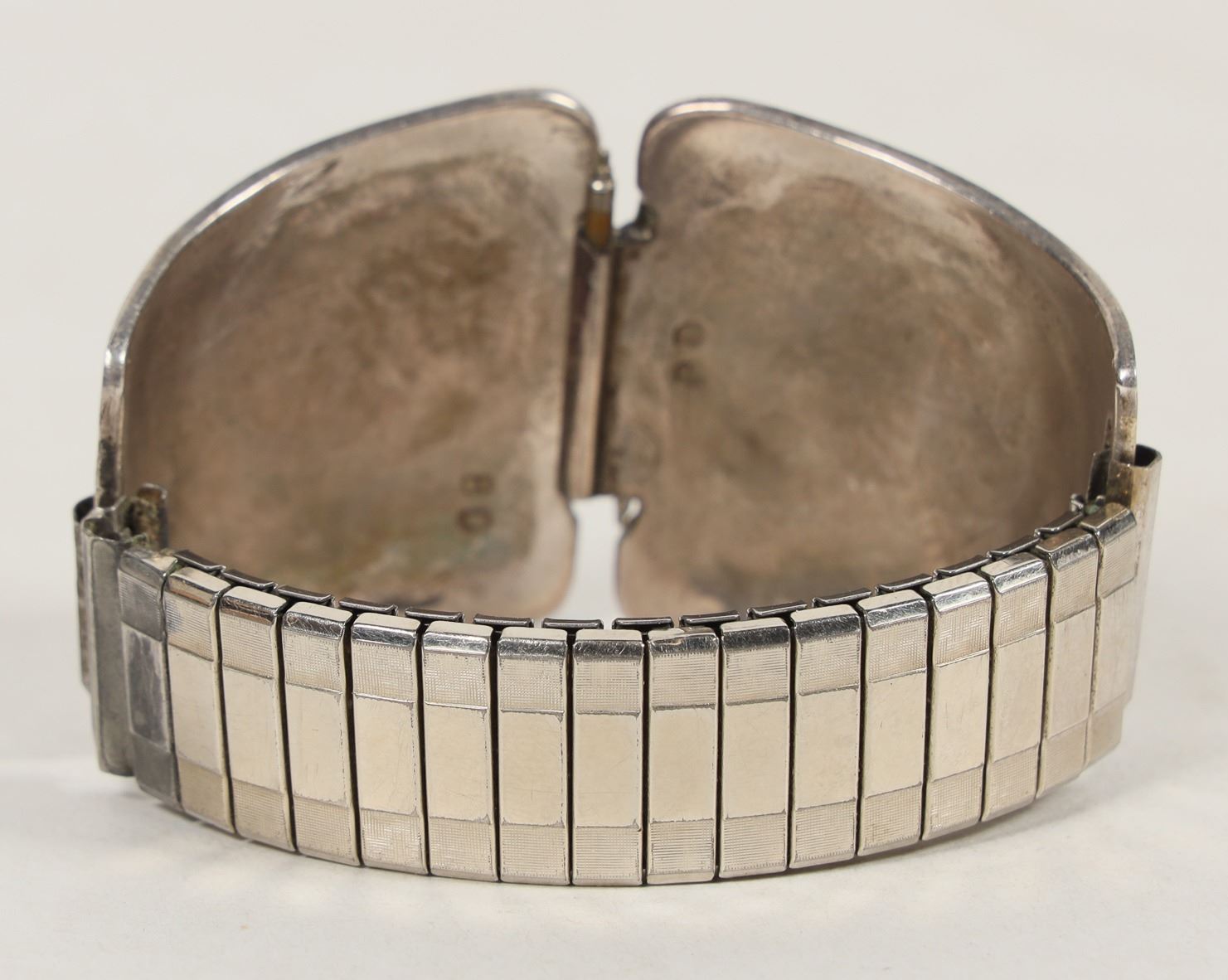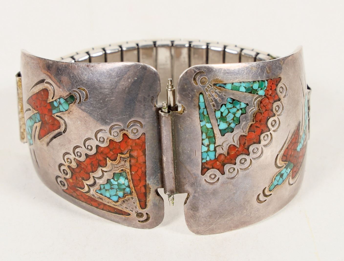 Sterling Watchband w/Coral & Turquoise Inlaid. Silver marked "BD".