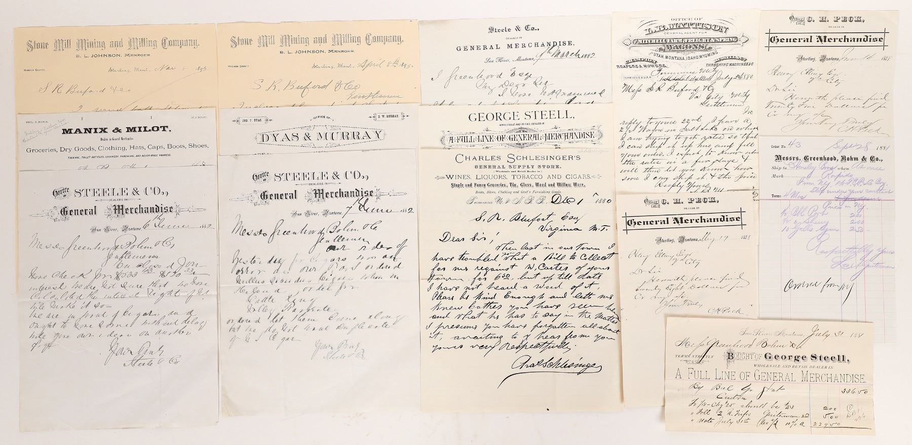 14 letterheads and billheads from Sterling and Sun River, c. 1878-95. To SR Buford, Henry Elling etc. Montana Sterling and Sun River