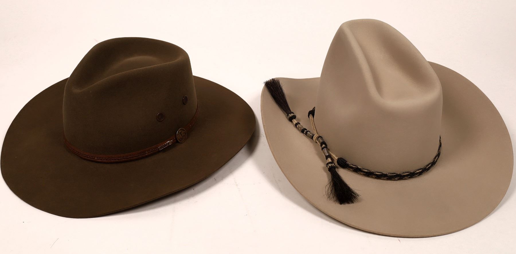 Stetson hat pair in original boxes, lightly worn if at all. 1.) Taupe with horsehair hat band size 7.25 2.) Brown leather hat band with buffalo nickle at side 7.25"