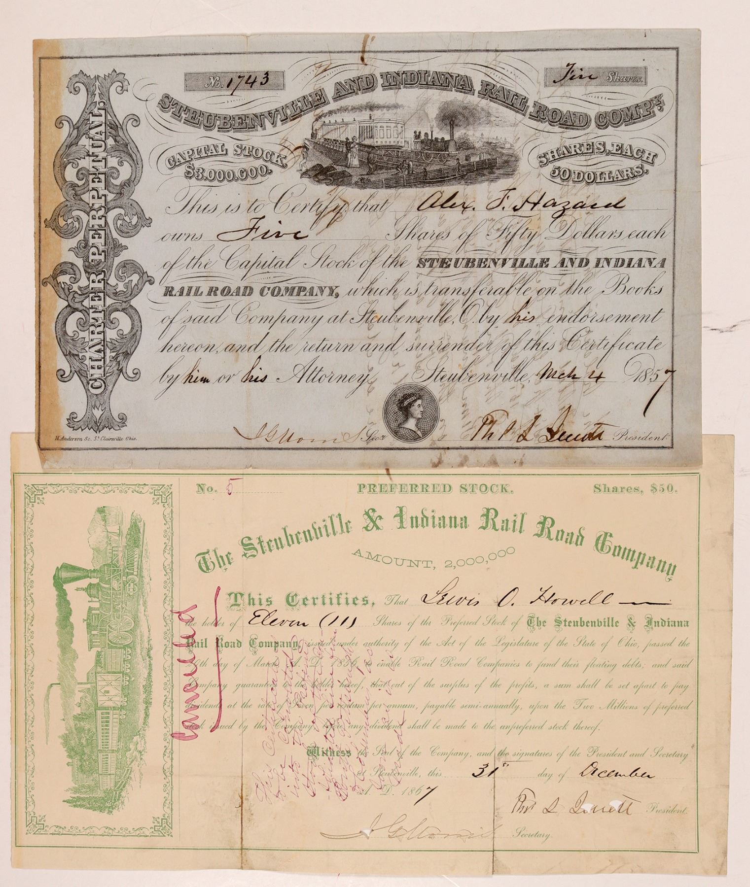 2. #5, I/C, $50 par 11 shares preferred stock. Issued Dec. 31, 1867 . Signed by president. GREEN, embossed seal, vignetted left side 4-4-0 w/ cars traveling countryside. Unknown printer. VF. Ken Prag Collection