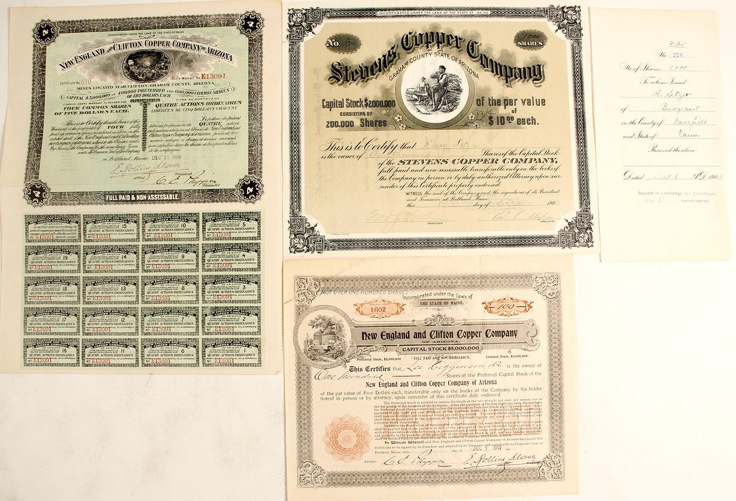 1) Stevens Copper Company. Number 276 for 1000 shares to Henry Setzer in 1903. Stub indicates this was an exchange for certificate #11. Signed by Thomas Taylor and Fred Hunt. No edge, corner, color or pinhole issues! Vignette of a miner taking a break and smoking a pipe. The Stevens owned 39 claims located 2 miles from Metcalf. The company shipped a little ore in 1906, but by the end of the year it was idle. 2-3) New England & Clifton Copper Company. Number 610 in green safety print for 4 shares signed by Pippin. In English and French. Number 1602 in tan with pink underprint. More common 1907 certificate to Lee Higginson & Company. Signed by CE Pippen and E Rollins Morse. This company was a merger fo the New England and Clifton companies. From 1906 to 1909 the company averaged 1,000,000 pounds of copper, 12,000 ounces of silver and 60 ounces of gold per year. {Garbani] (Laguna Collection) HWAC# 62971 Date: Location: Graham, Clifton, Arizona