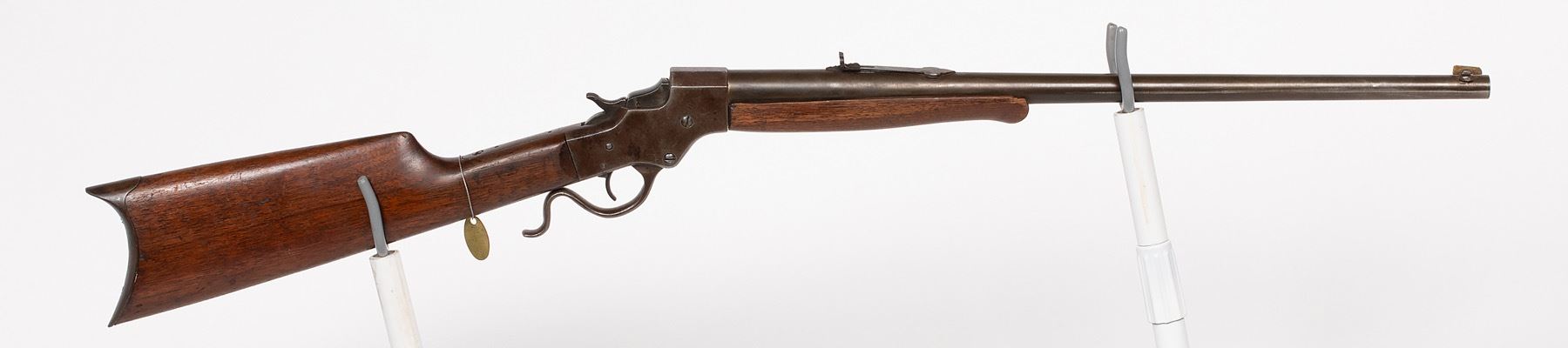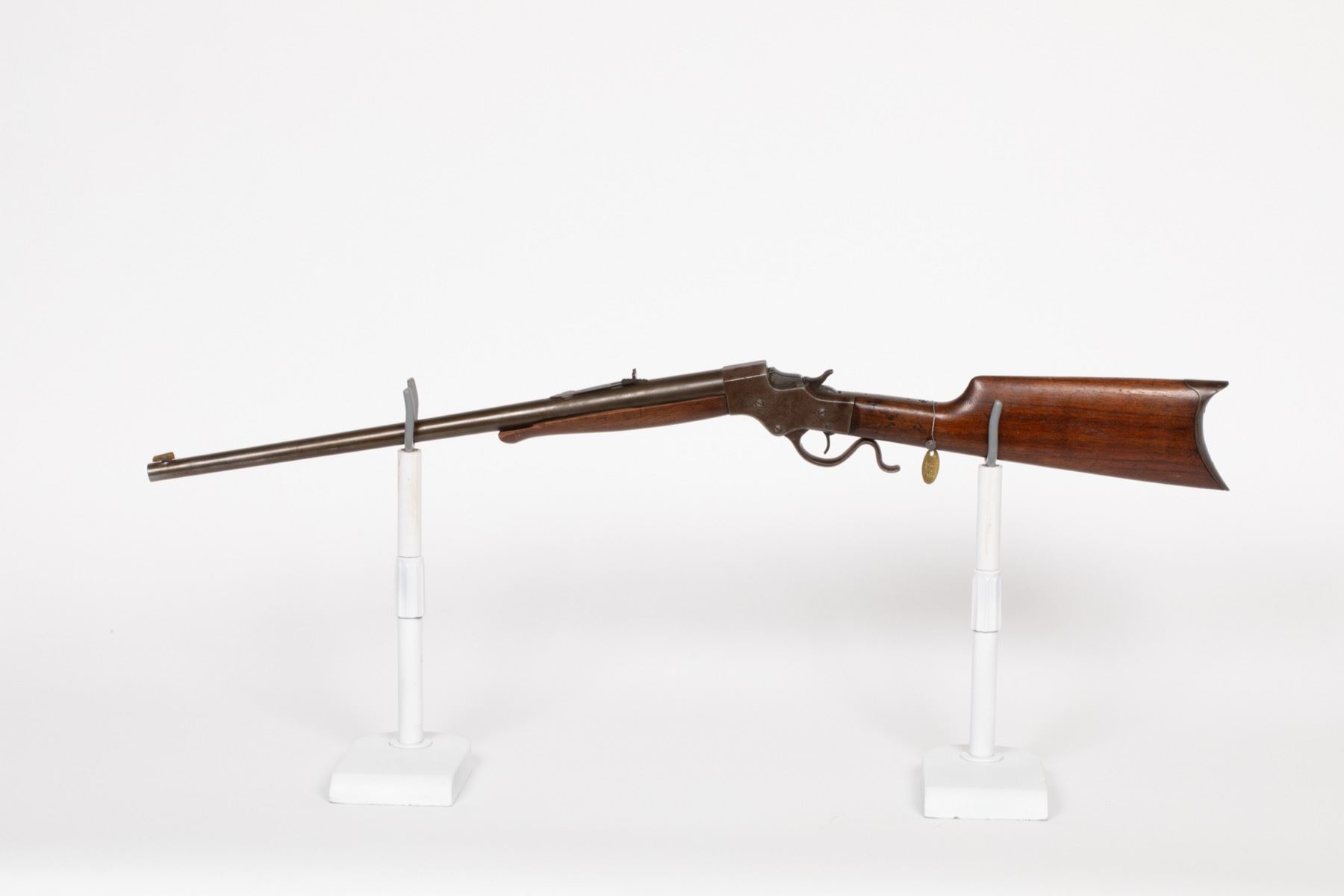 Steven's Arms Company, 44 TARGET.22, single-shot falling-block, Blade front sight w/rear leaf adjustable sight. smooth fore/pistol grip, crescent metal butt plate. SN: 59736, JMD Oval Tag: 7629, Condition: Good, >