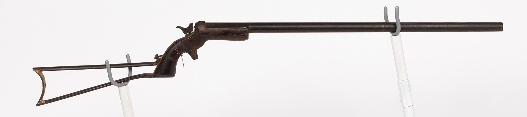 This is a pistol/ shotgun made by Stevens. A single-shot shotgun, in good condition. SN: N/A, JMD Oval Tag: 8960, Condition: Good, >