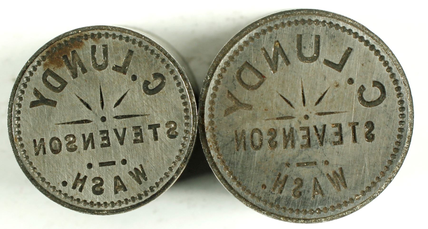2 token dies self identified from Stevenson, WA. 21mm: C Lundy. 24mm: C Lundy. Northwest Territorial Historical Die Collection.
