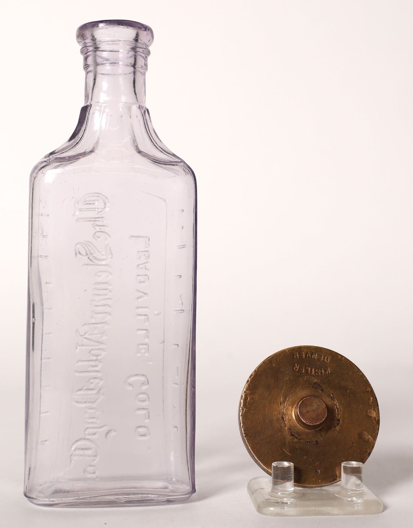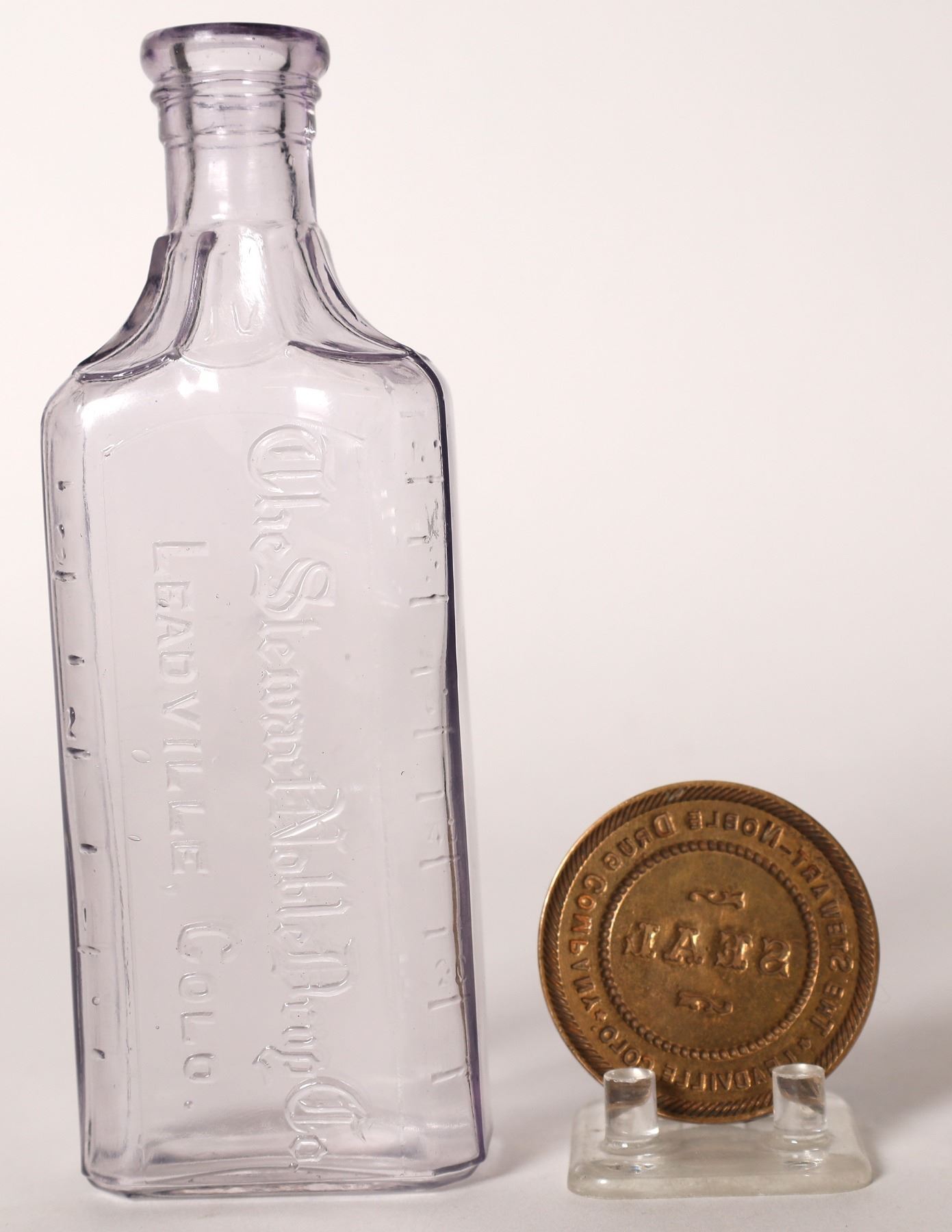 Steward-Noble Drug Company Drugstore Bottle, 4oz, clear, problem free, 6" tall, rated R5, the rarest rating in Prebble. A choice example. Reed was very observing, and found the company's brass seal which was apparently dug in the Leadville dump. 1-3/4" diameter, a classic "go-with" for this exceptionally rare bottle. Ron Reed Collection