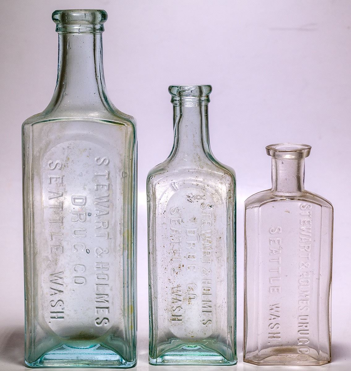 STEWART & HOLMES DRUG. CO. / SEATTLE, WASH. 3 rectangulars. 4.75" clear, 6.25" aqua, 8" aqua. Page 327 and 330 in Holabird, books examples. No visible chips or cracks. Date: c. 1882+ Location: Seattle, Washington HWAC# 57928