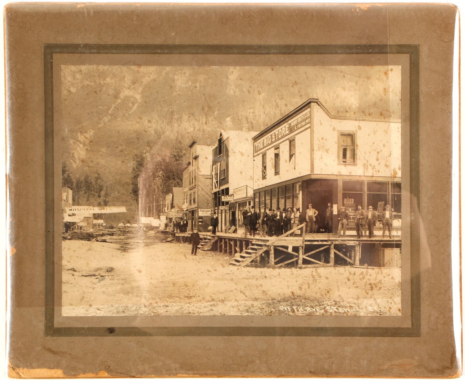 Identify The Big Store, Dubec Cigar, McMillan transfer, DeMills transfer, Portland Magazine, Stewart gents store, etc. Shows the left side of Fifth Street with many citizens posing for the Evans Photograph. 1910. Foxing throughout and some border issues. But very high quality. 8 x 11".