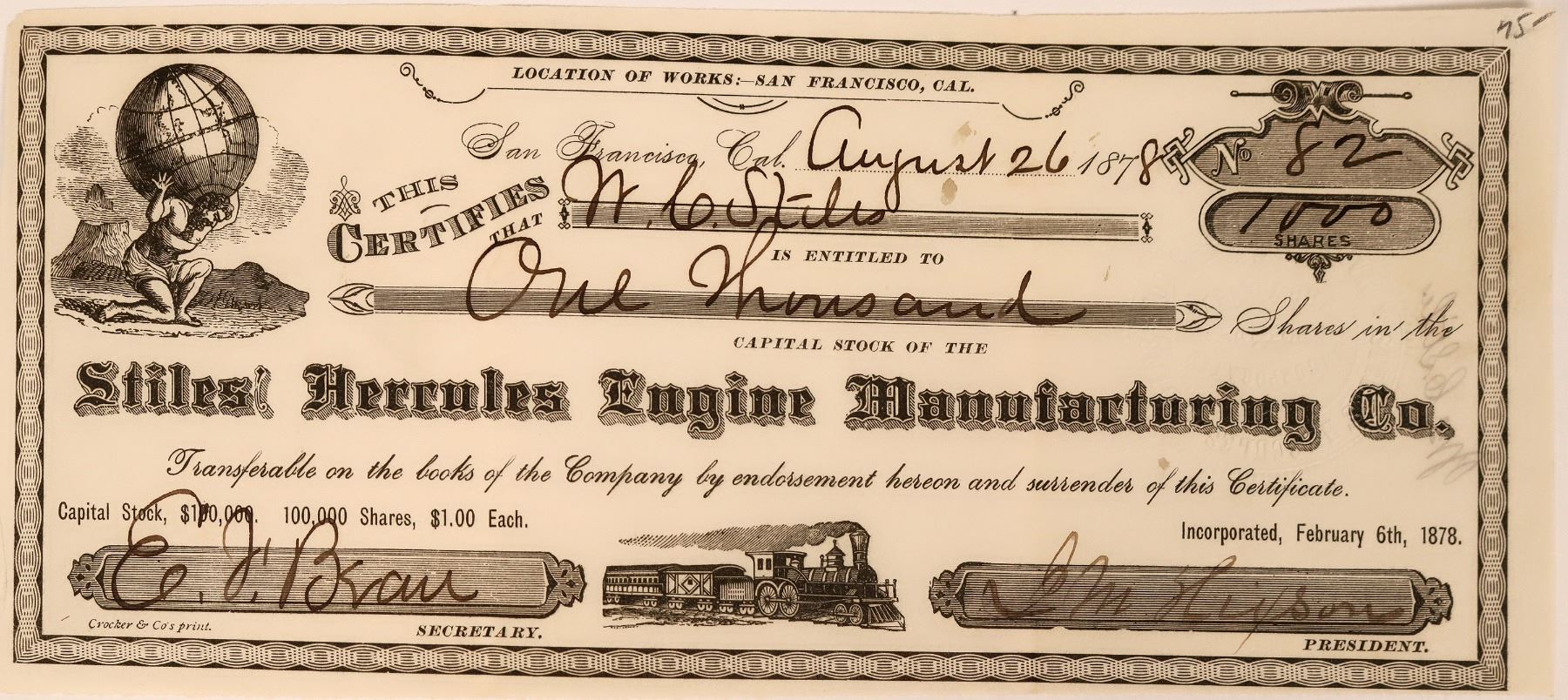 Location of Works: San Francisco, Cal. (printed at top center). Inc. February 1878. No. 82, issued to inventor and company founded WC Stiles for 1,000 shares on August 26th, 1878 in San Francisco. Signed by president Wilson and secretary Bean. Not cancelled. Black border and print, two vignettes: locomotive (bottom center) and Atlas holding a globe (upper left). Printed by Crocker & Co. Folds, rounded corner upper left, According to a detailed article in the July 20th, 1878 issue of the Mariposa Gazette (which includes an illustration), this company built rotary steam engines for many purposes including boats. Stiles even had one on display in the basement of the Cosmopolitan Hotel in San Francisco. A later article from that year says the engine will be on display at the Mechanics' Institute Fair in SF, and will be over 100 horsepower with two cylinders that are 20 ft. in length. This engine seems to hav emany uses: Marine mentioned in the article above. Railroad as it is listed by Terry Cox.